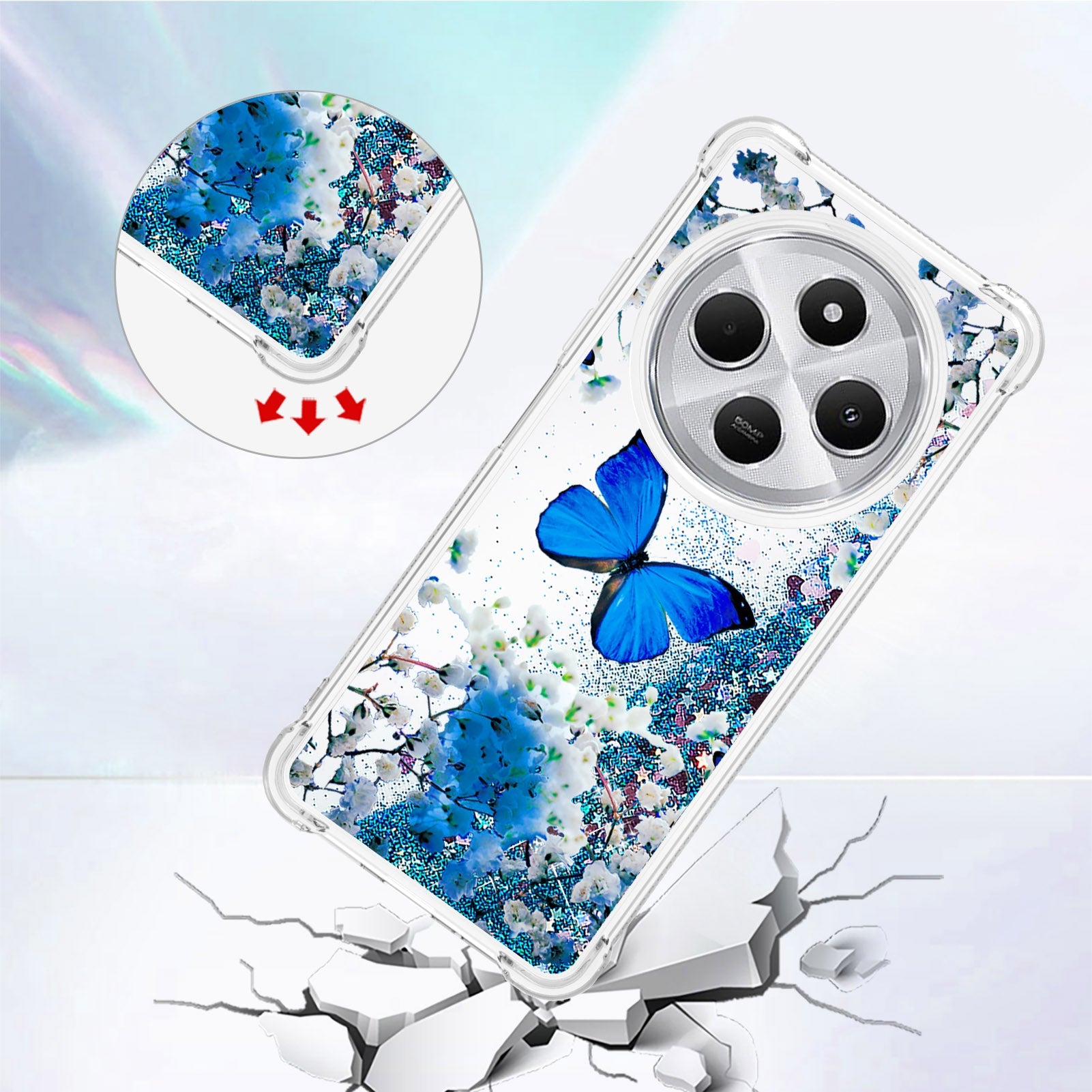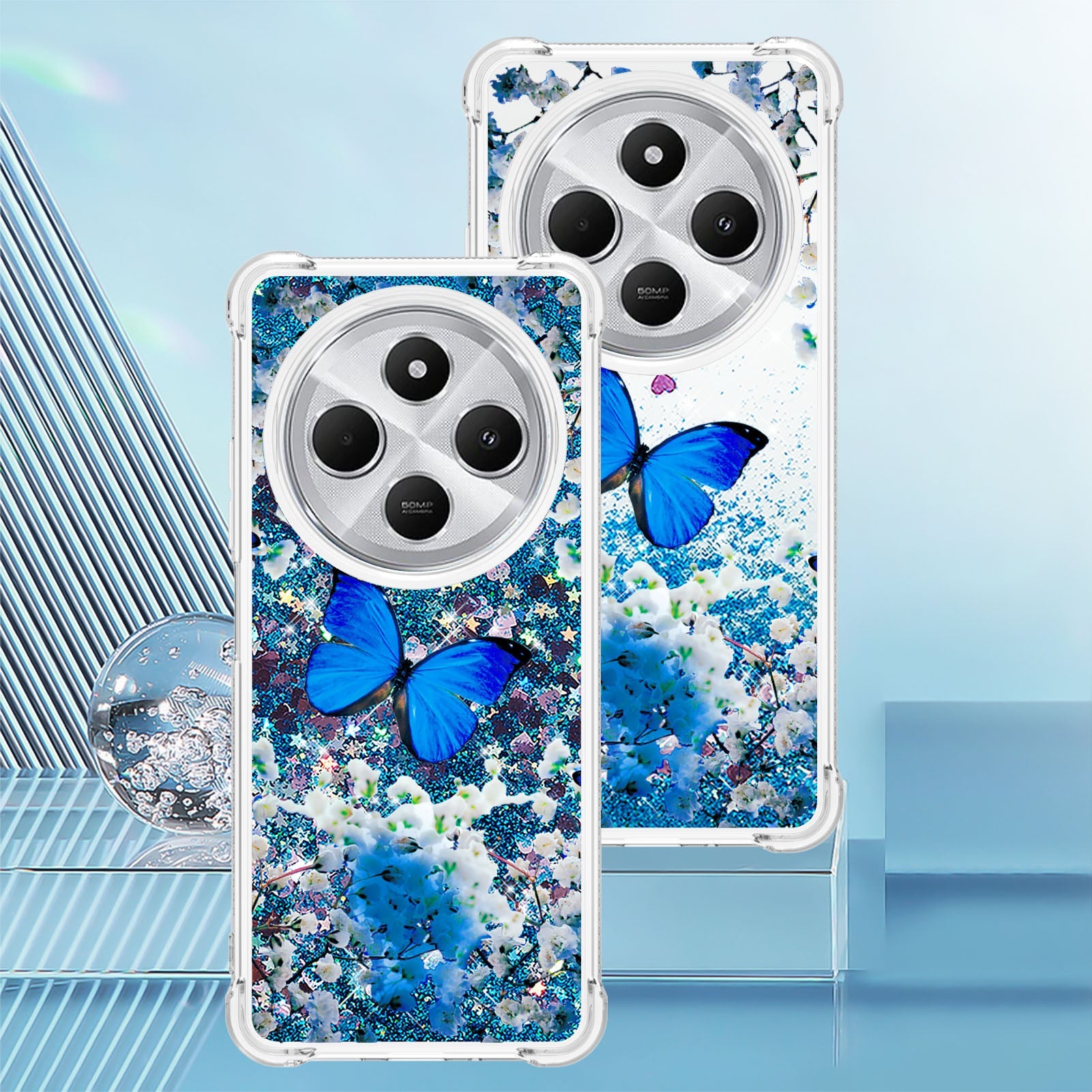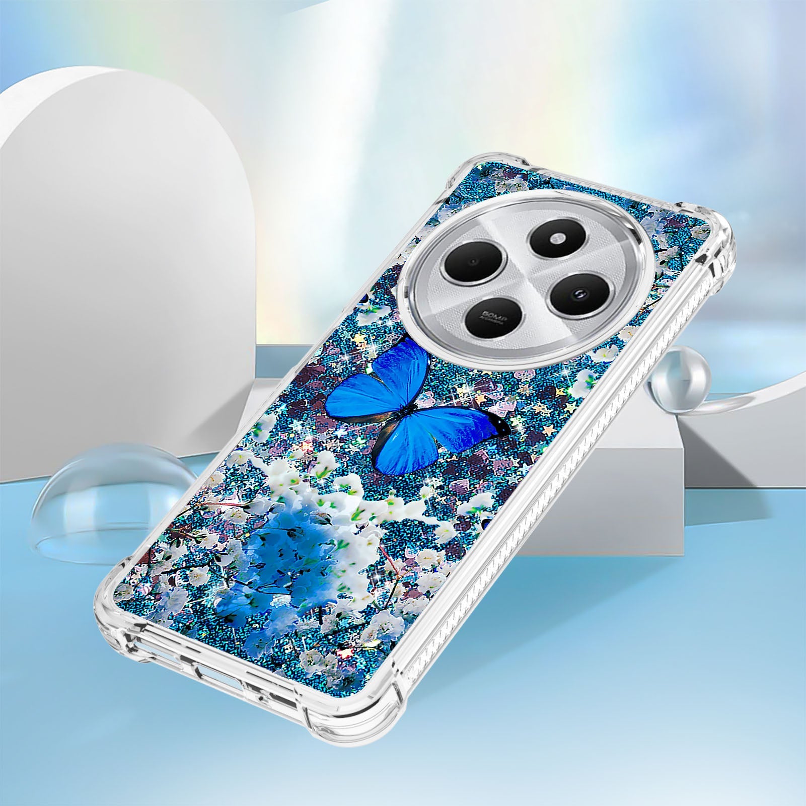 For Xiaomi Poco C75 4G / Xiaomi Redmi 14R 5G / Xiaomi Redmi 14C 4G Case YB Quicksand Series-2 Liquid Quicksand Pattern TPU Phone Cover - Blue Butterfly