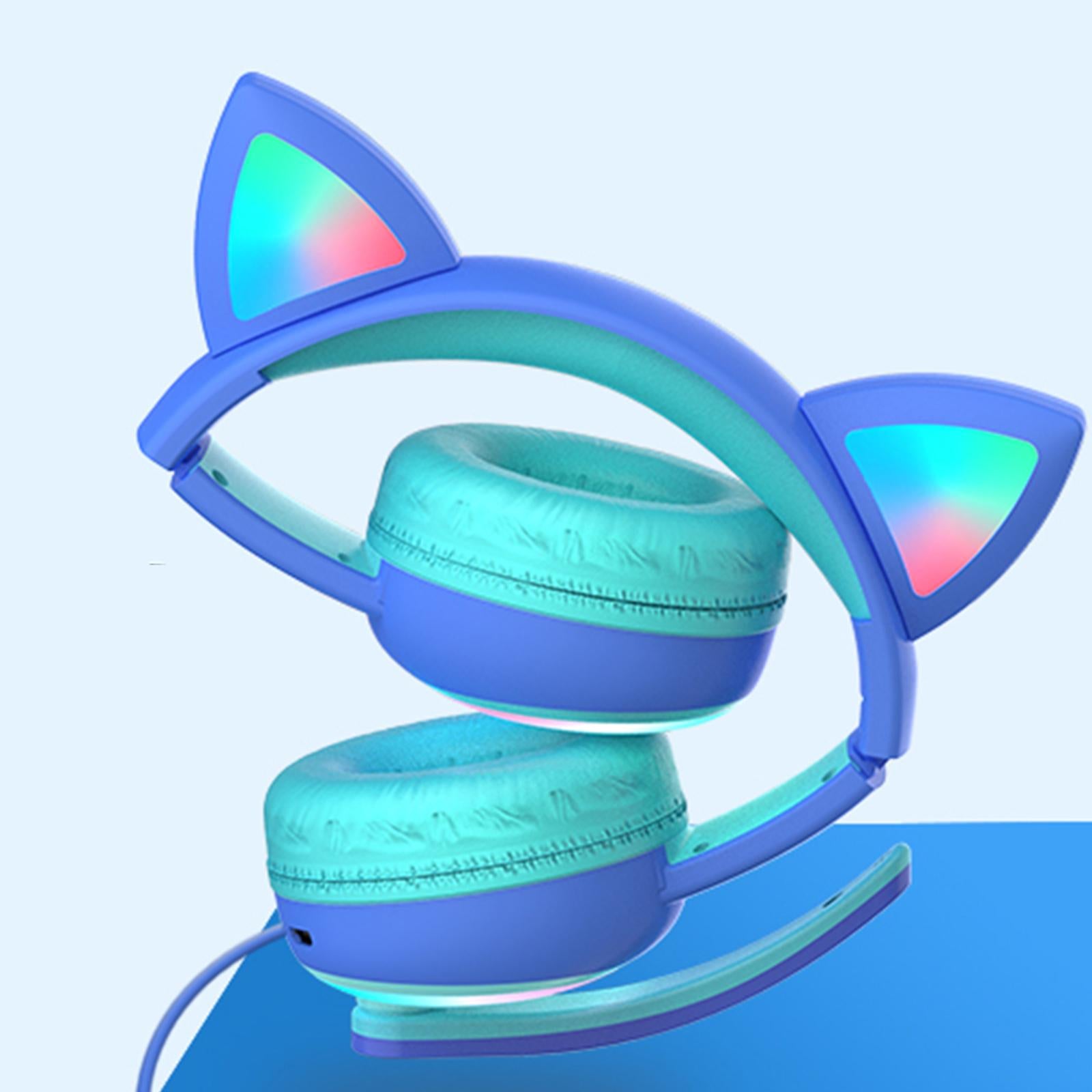 Kid LED Fashion Cute Cat Ear Headphones On-Ear Headsets with Mic Foldable Wired Dark Blue