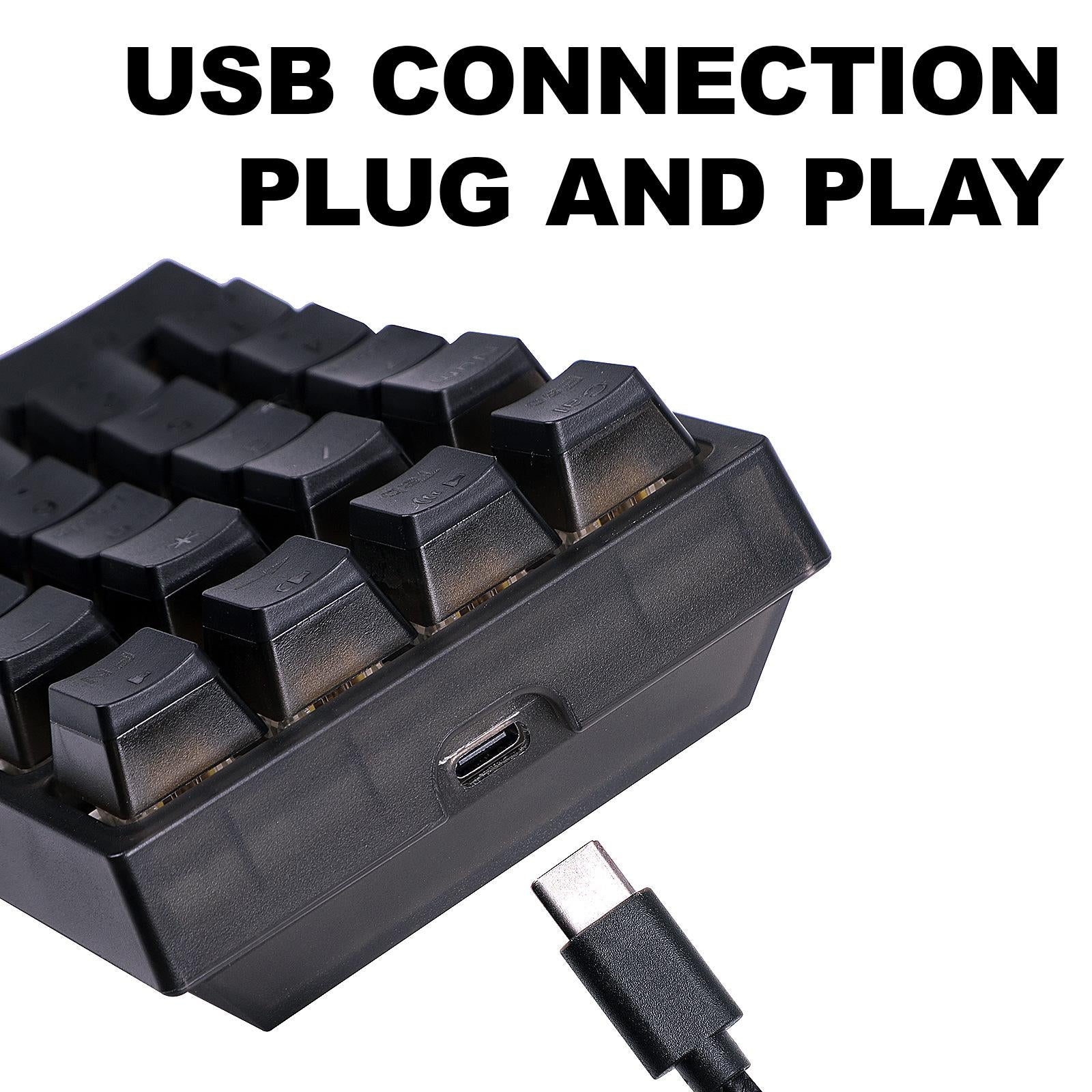 21 Keys Numpad: The 21 key mini customized mechanical keyboard, USB cable power supply, plug and play.