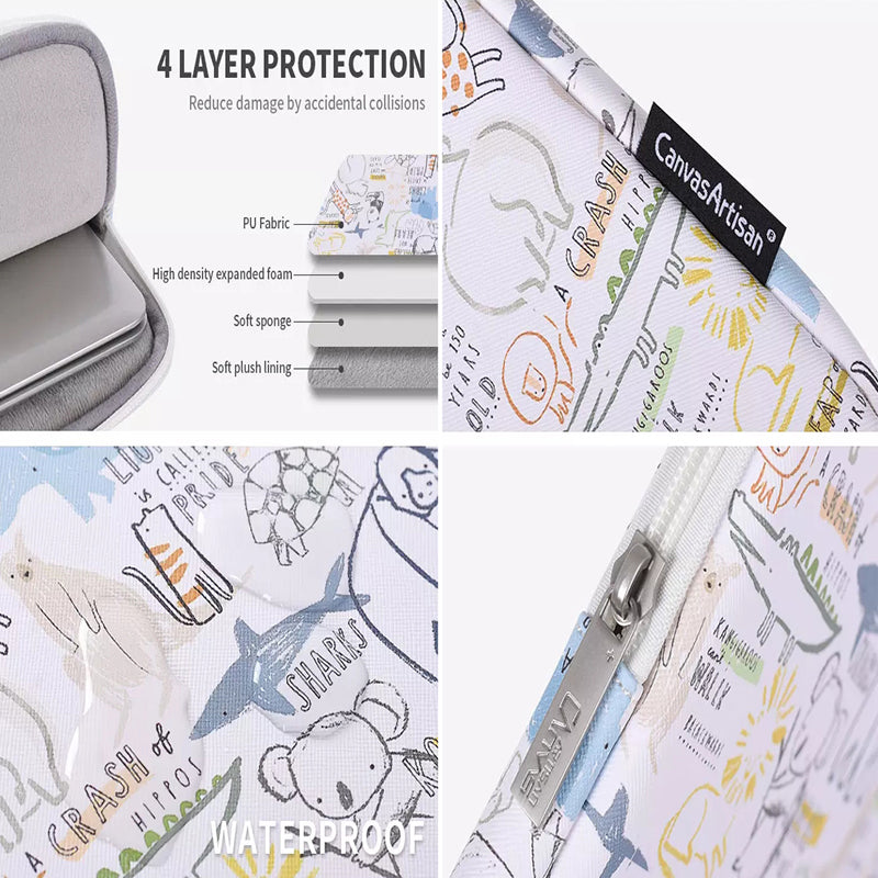 Cartoon Animals Pattern Protective Laptop Sleeve PU Leather Zipper Notebook Bag - White/for 14-inch Laptop