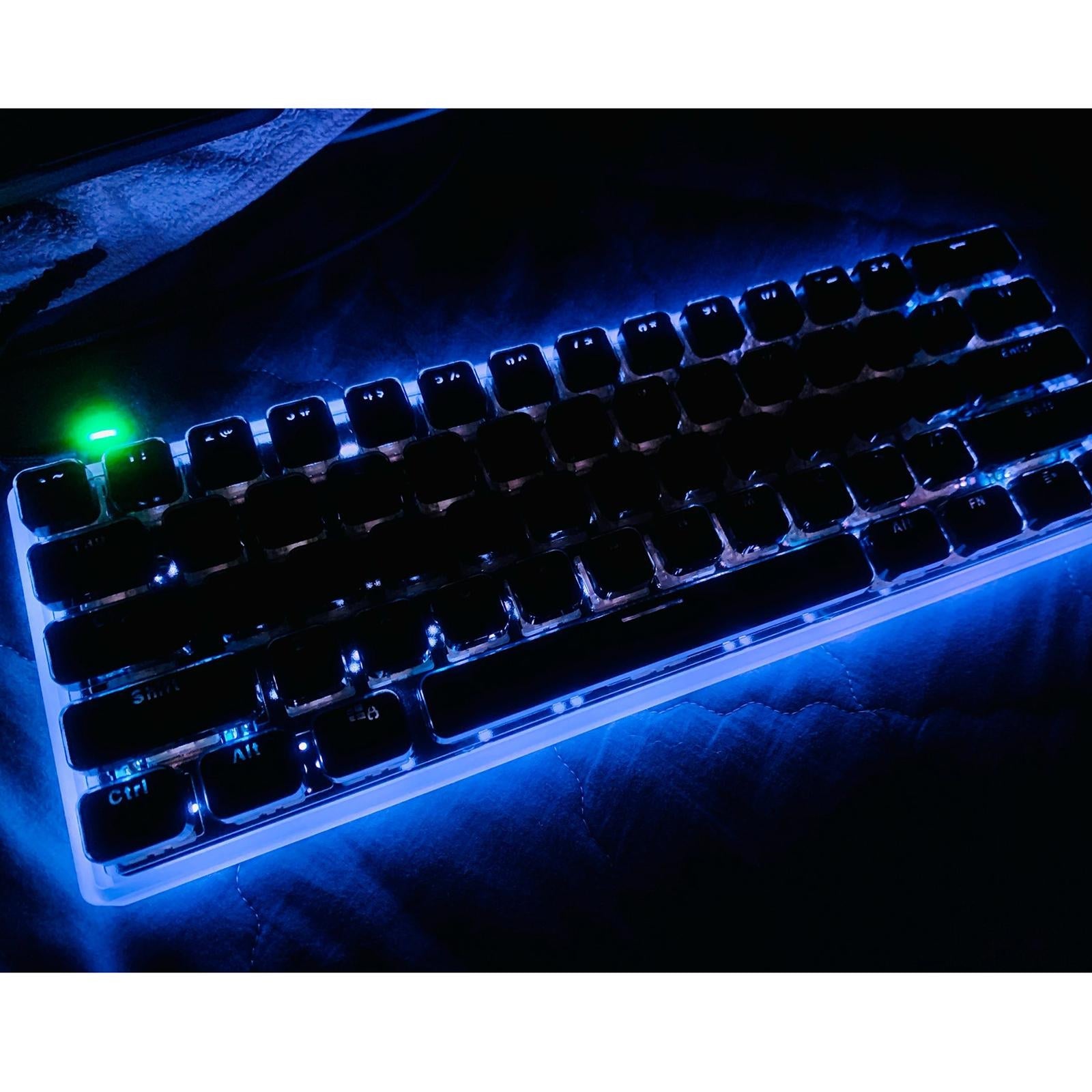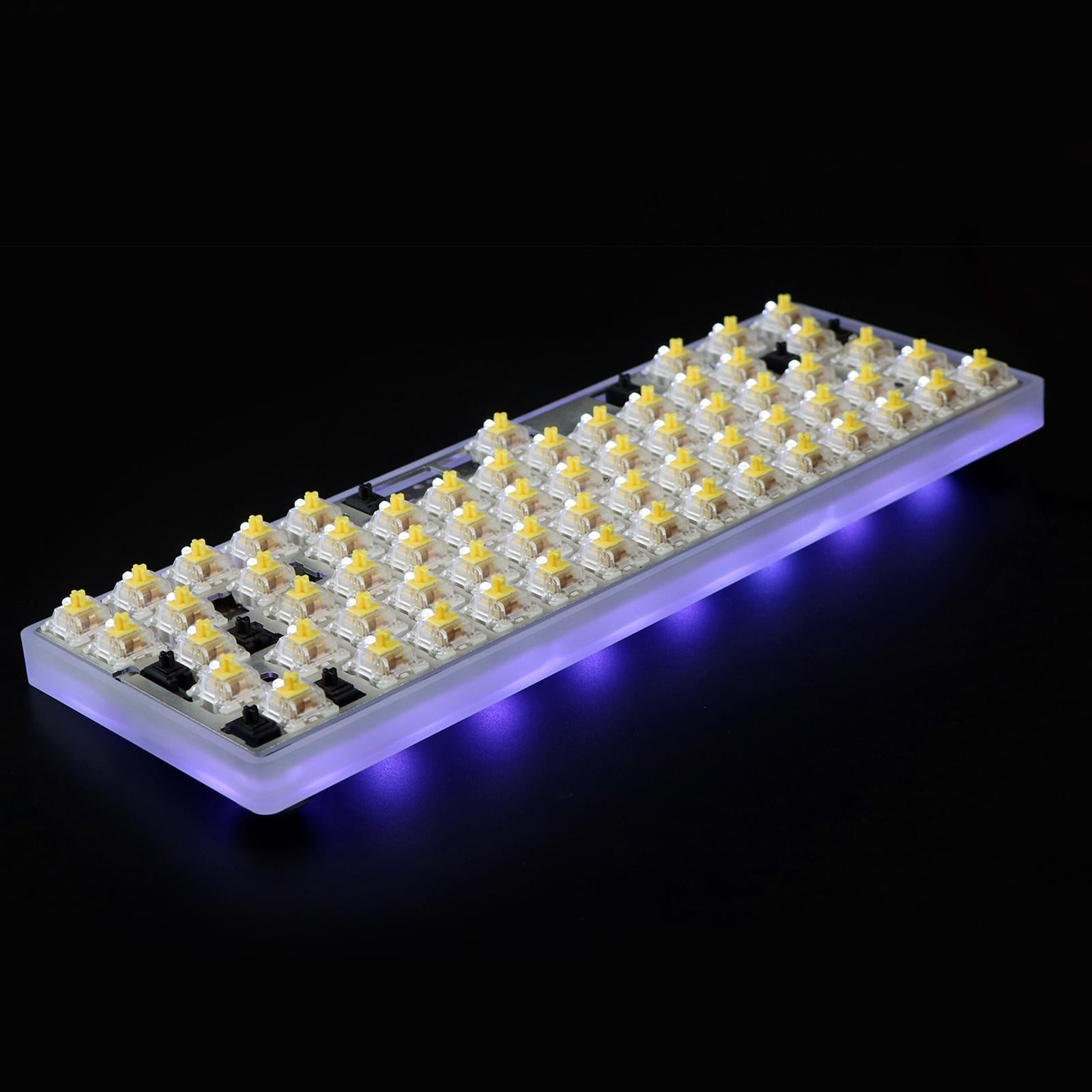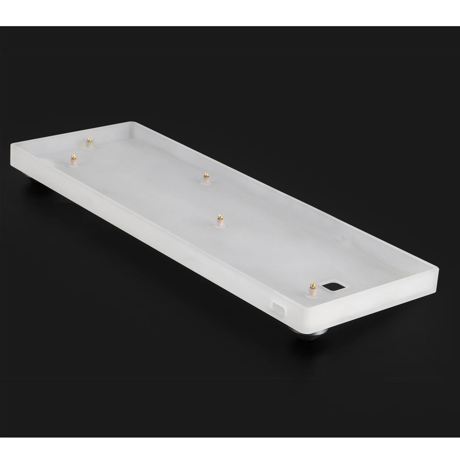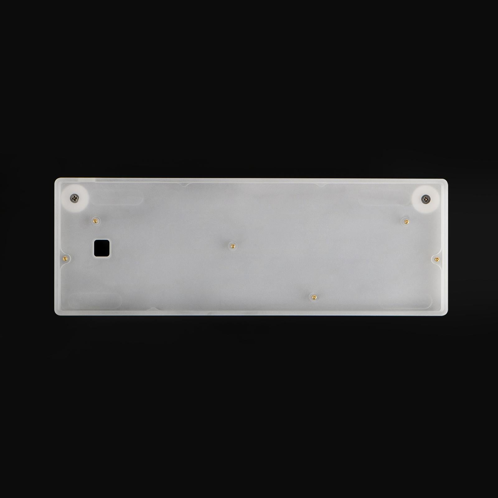The keyboard case is made of frosted acrylic. It supports slightly underglow led shine through.