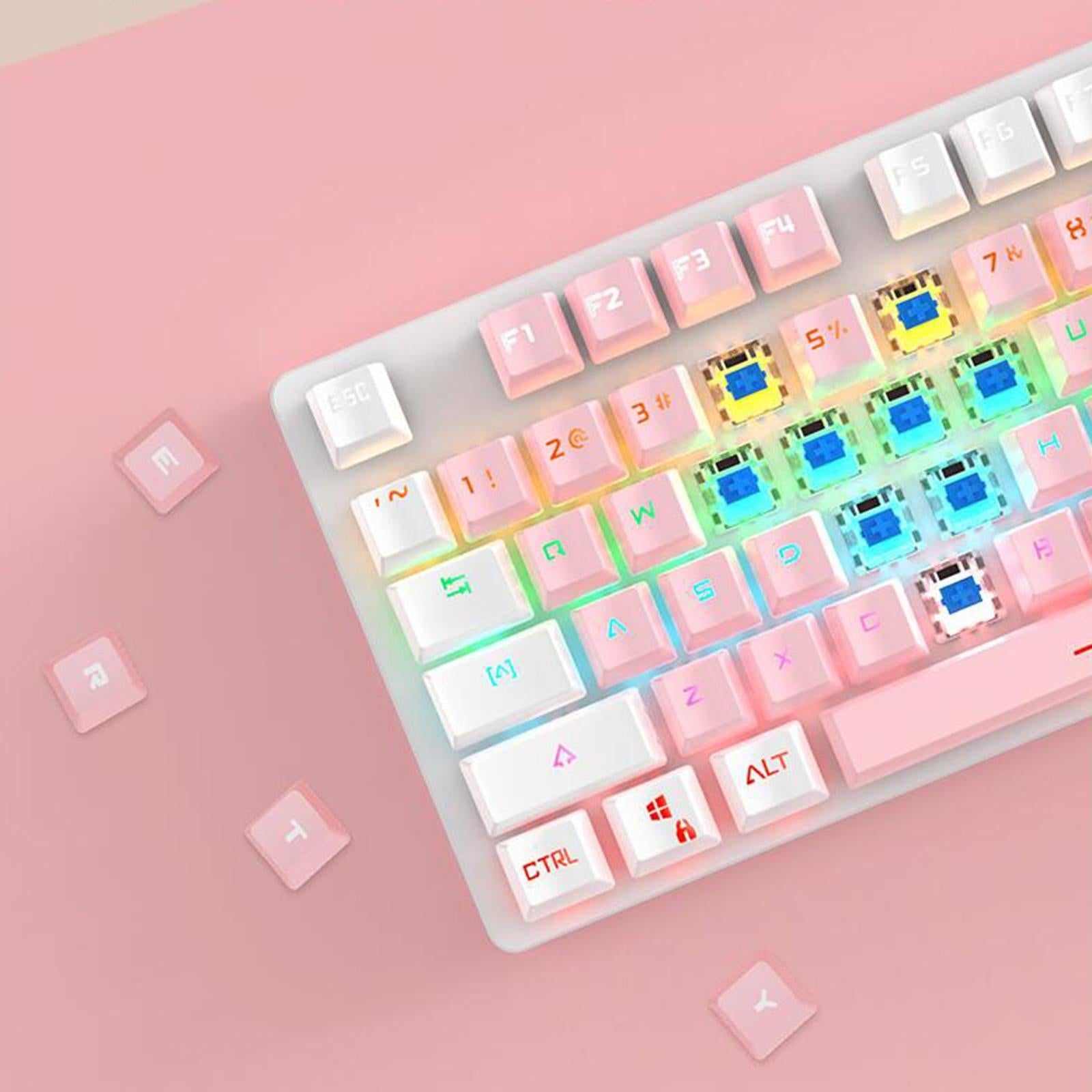 USB 87 Keys Blue Axis Cute Wired Gaming Keyboard Quiet Design Pink+White