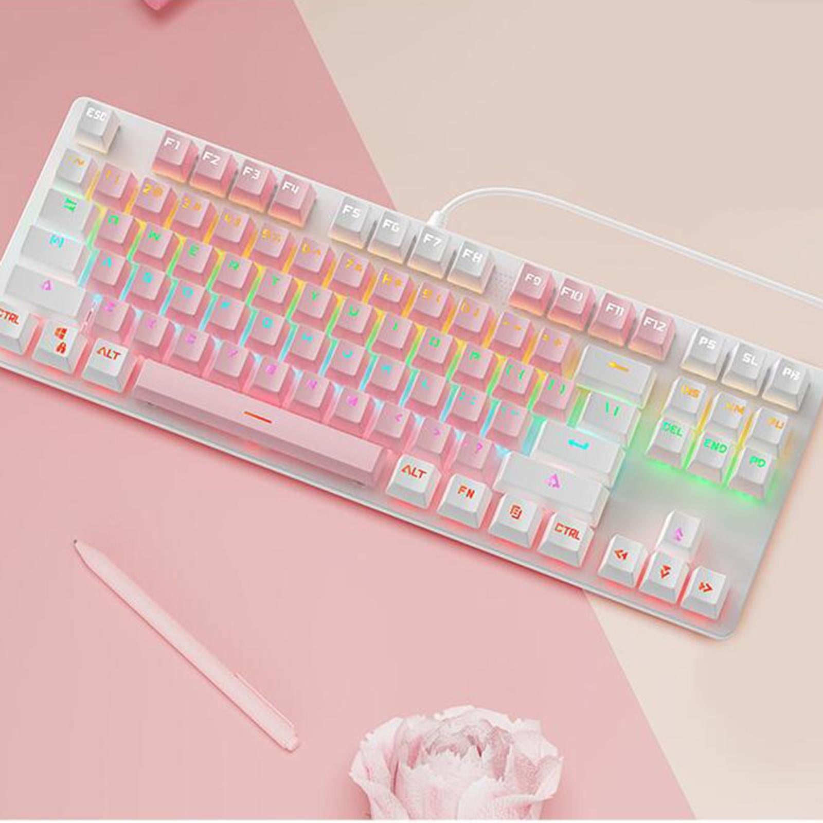 USB 87 Keys Blue Axis Cute Wired Gaming Keyboard Quiet Design White+blue