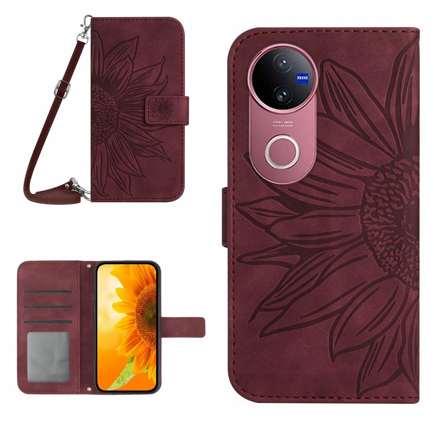 For vivo V50 5G Global Skin Feel Sun Flower Embossed Flip Leather Phone Case with Lanyard(Wine Red)