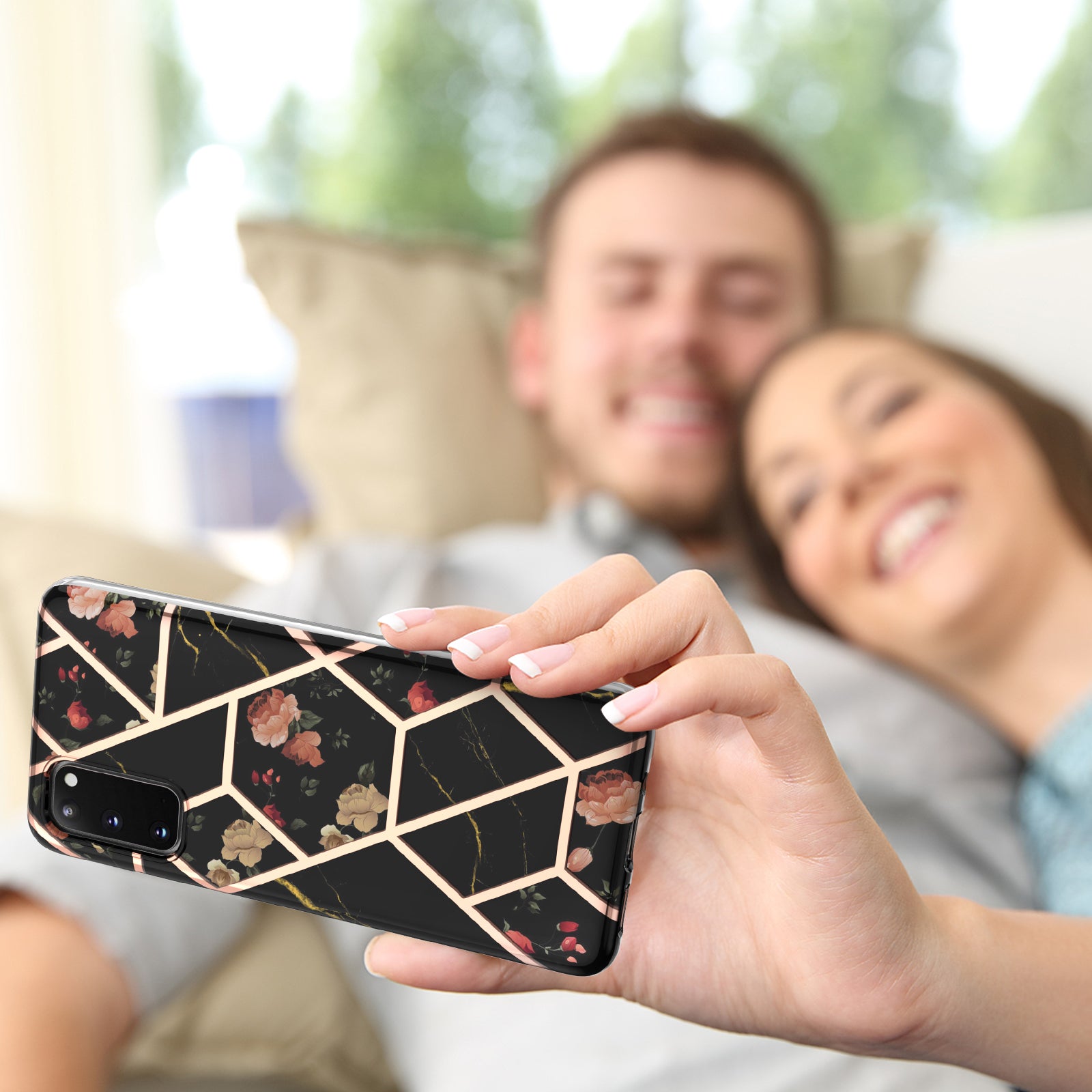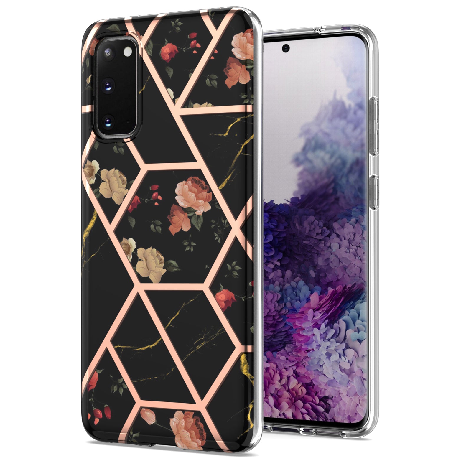 Anti-scratch Stylish Marble Design IMD IML Electroplating Soft TPU Phone Case Cover for Samsung Galaxy S20 4G/S20 5G - Black Flowers