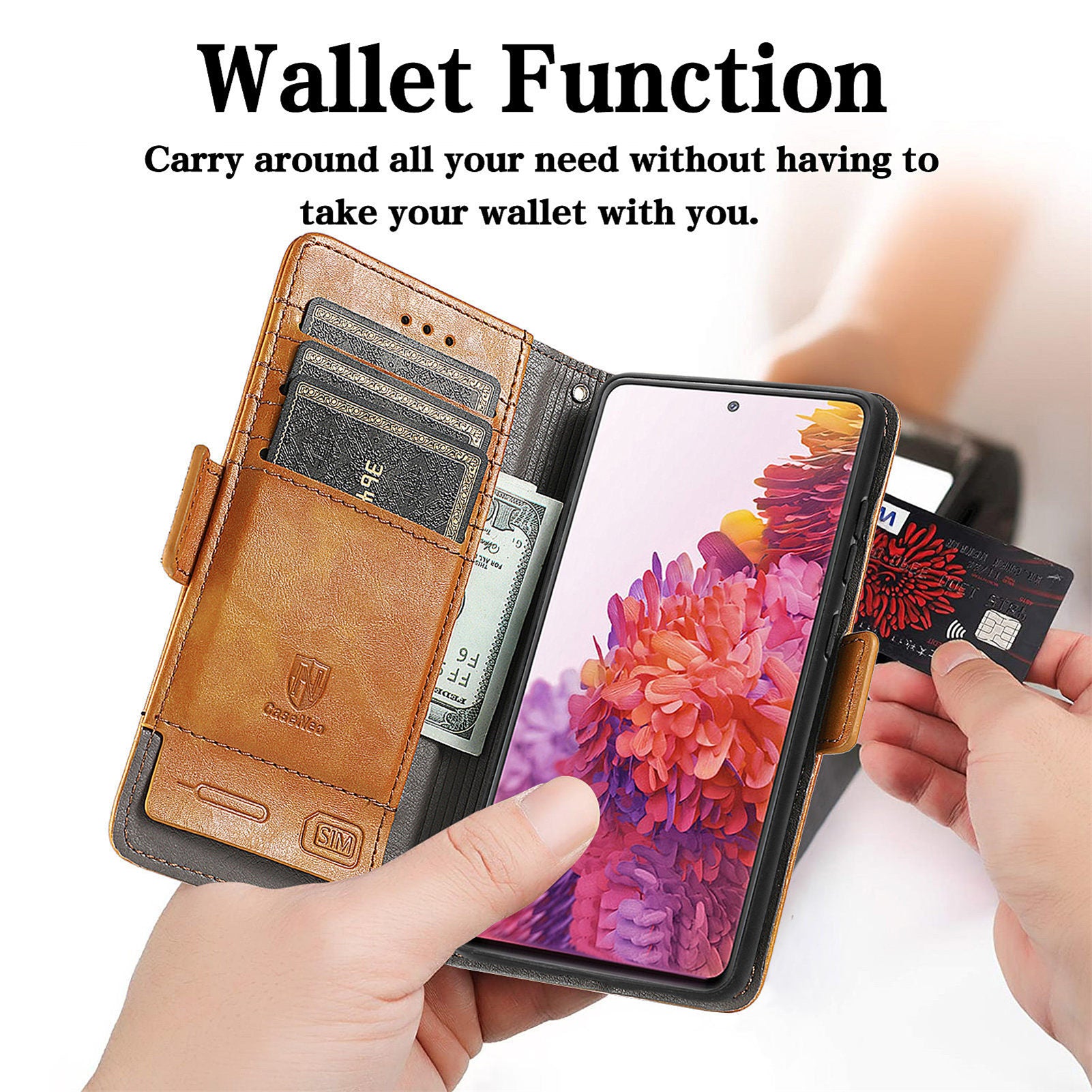 CASENEO 002 Series Scratch-Resistant Anti-Drop Business Style Splicing PU Leather Stand Wallet Case for Samsung Galaxy S20 FE/S20 FE 5G/S20 Lite/S20 FE 2022 - Light Brown