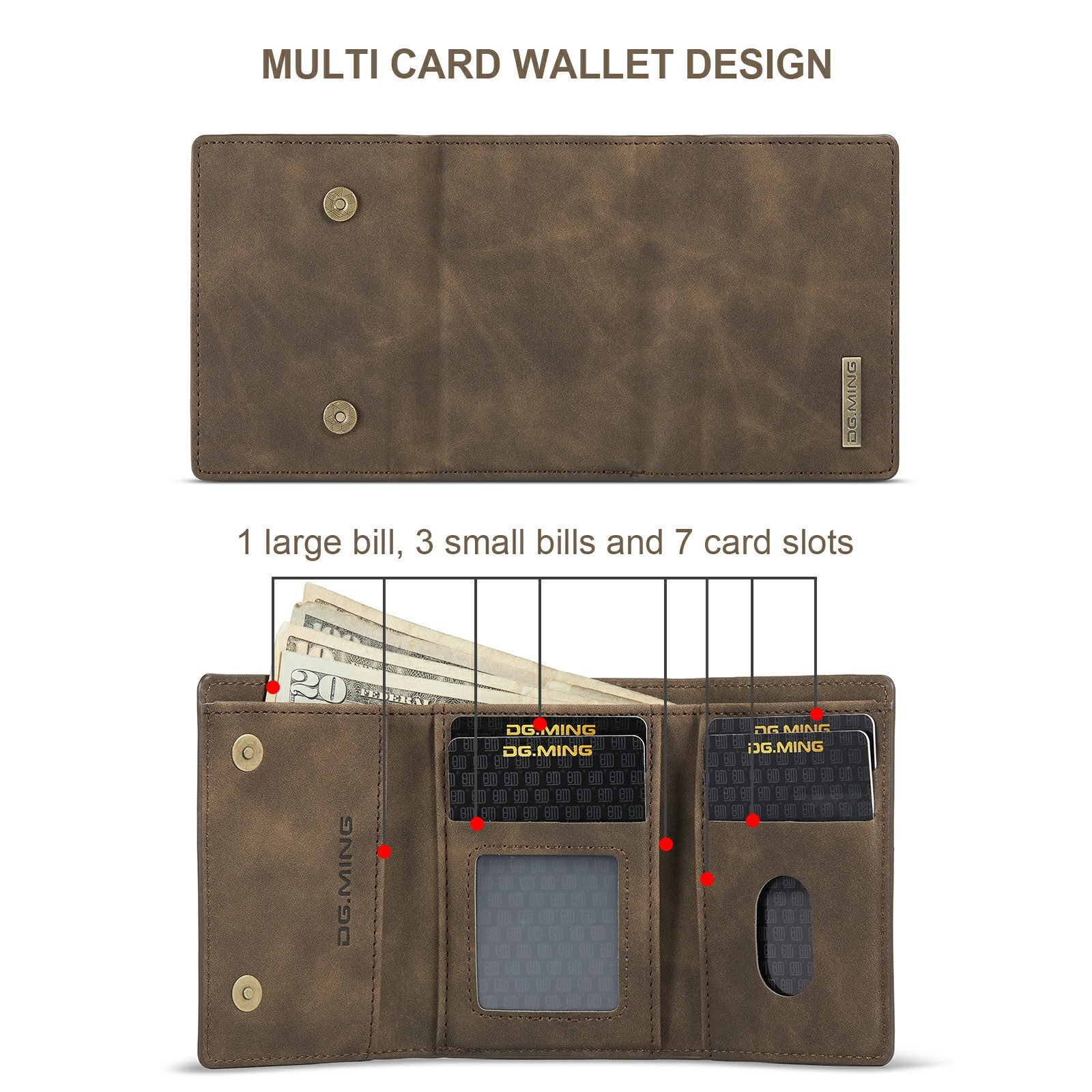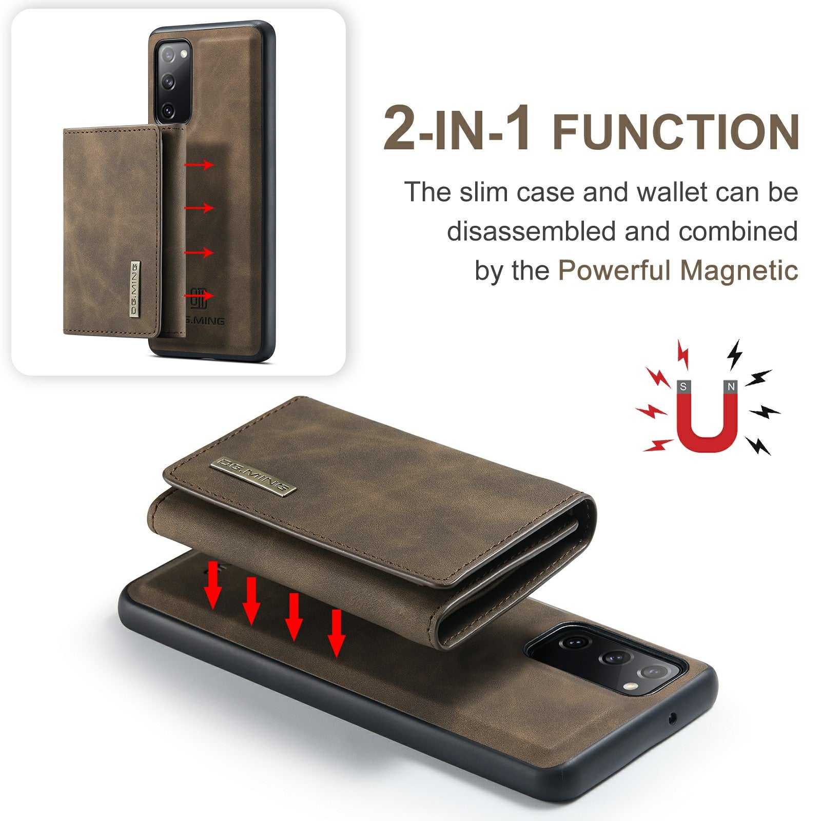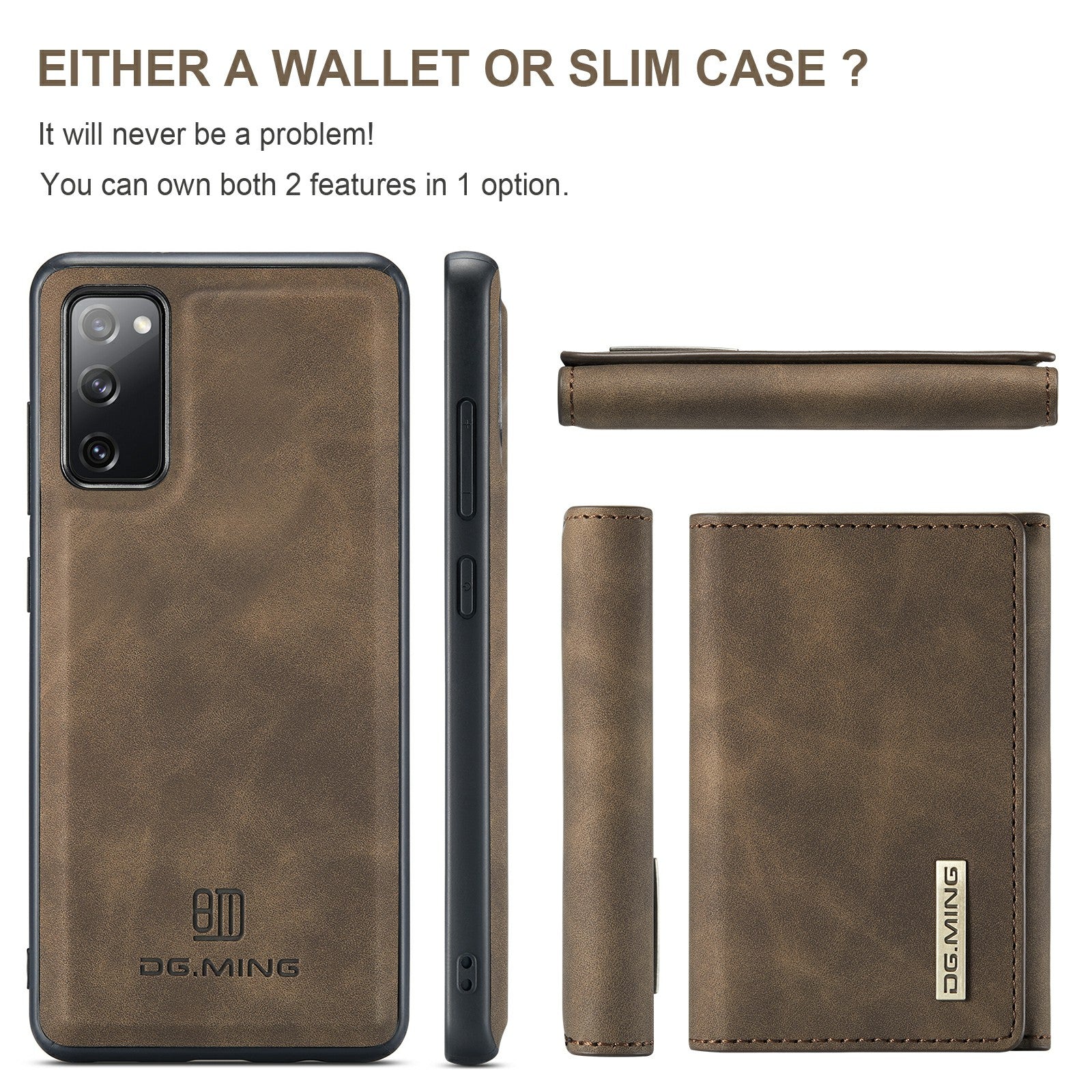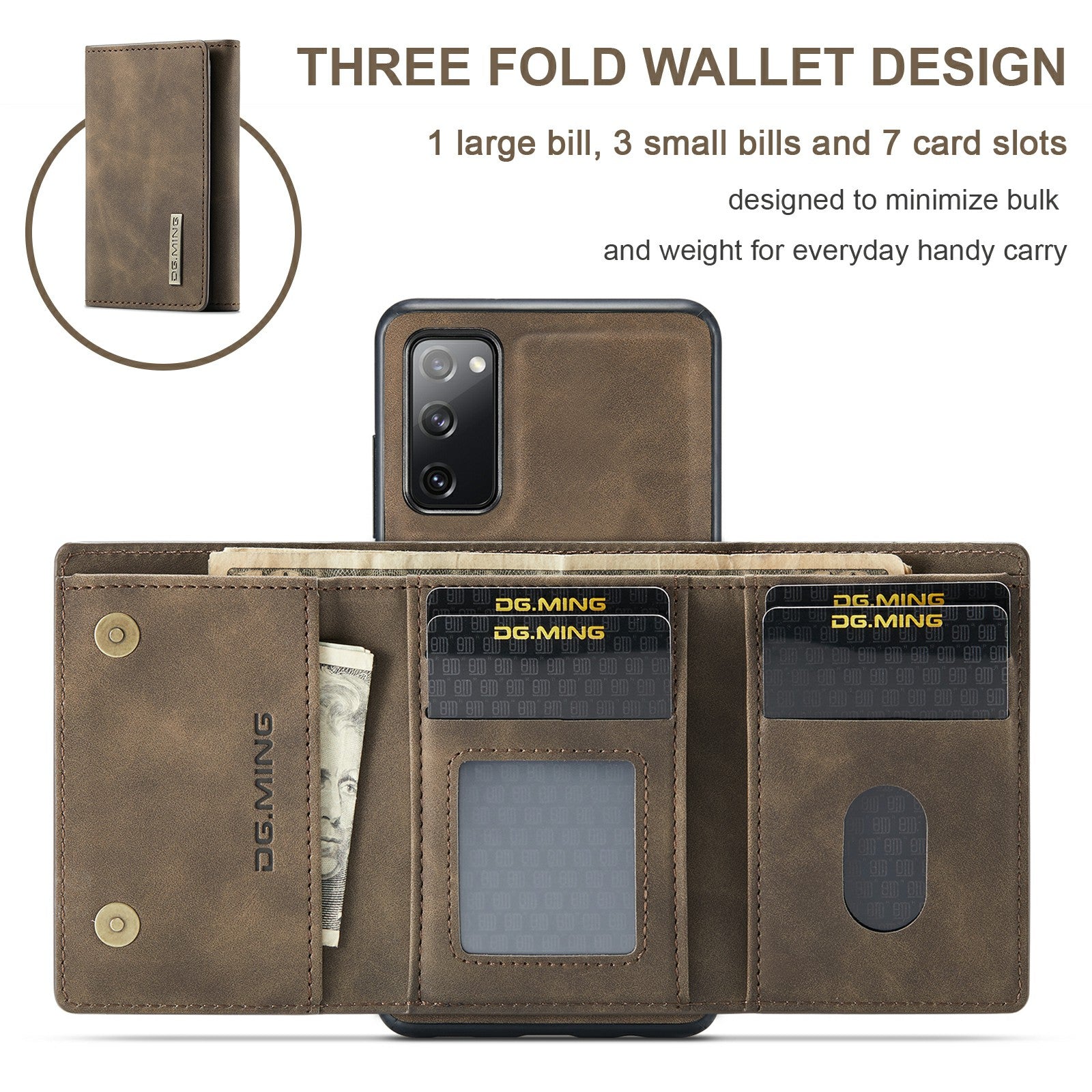 DG.MING M1 Series Magnetic Tri-Fold Wallet + Leather Coated Hybrid Cover Shell with Kickstand for Samsung Galaxy S20 FE 2022/S20 FE 4G/S20 FE 5G/S20 Lite - Coffee