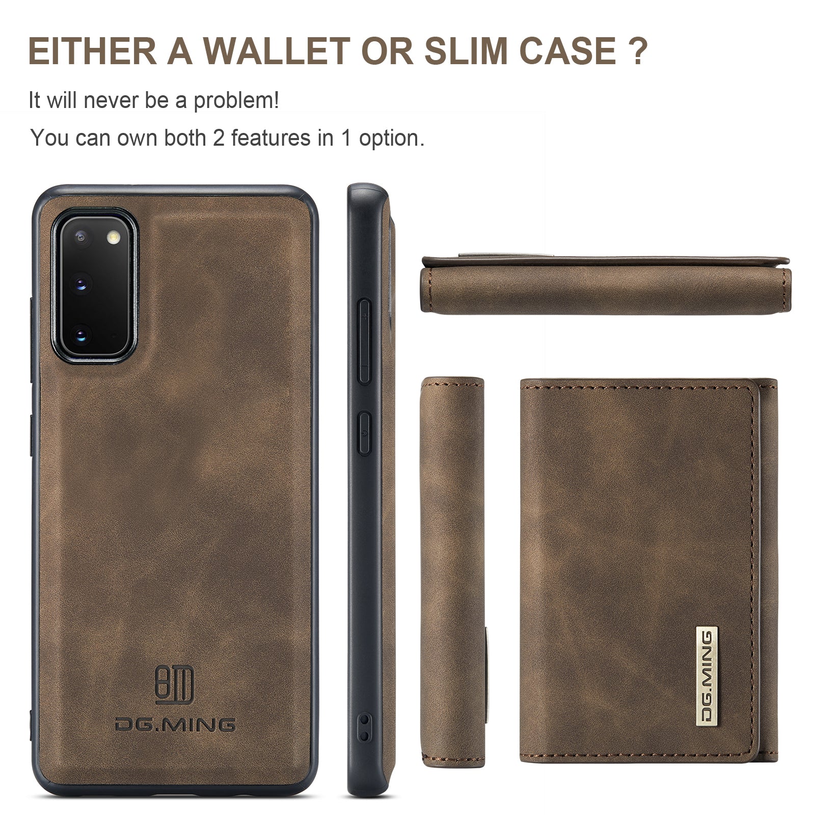 DG.MING M1 Series Powerful Magnet Wireless Charging Anti-Scratch Detachable Wallet 2-in-1 Hybrid Phone Shell with Kickstand for Samsung Galaxy S20 4G/S20 5G - Coffee