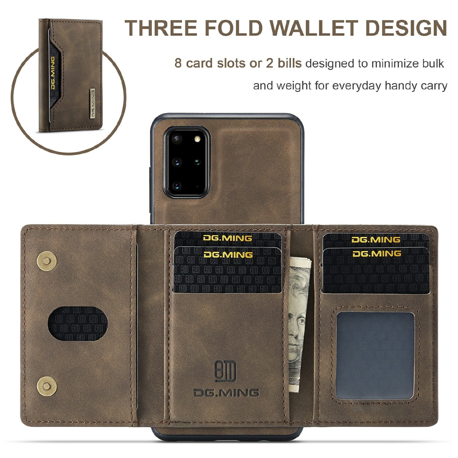 DG.MING M2 Series Anti-drop Magnetic Wallet Design with Kickstand Leather Coated Hybrid Case for Samsung Galaxy S20 Plus - Coffee