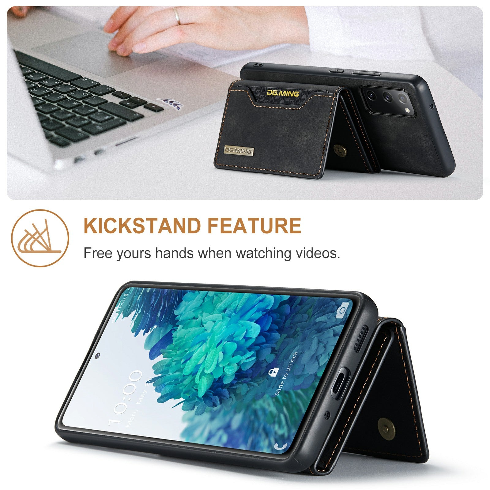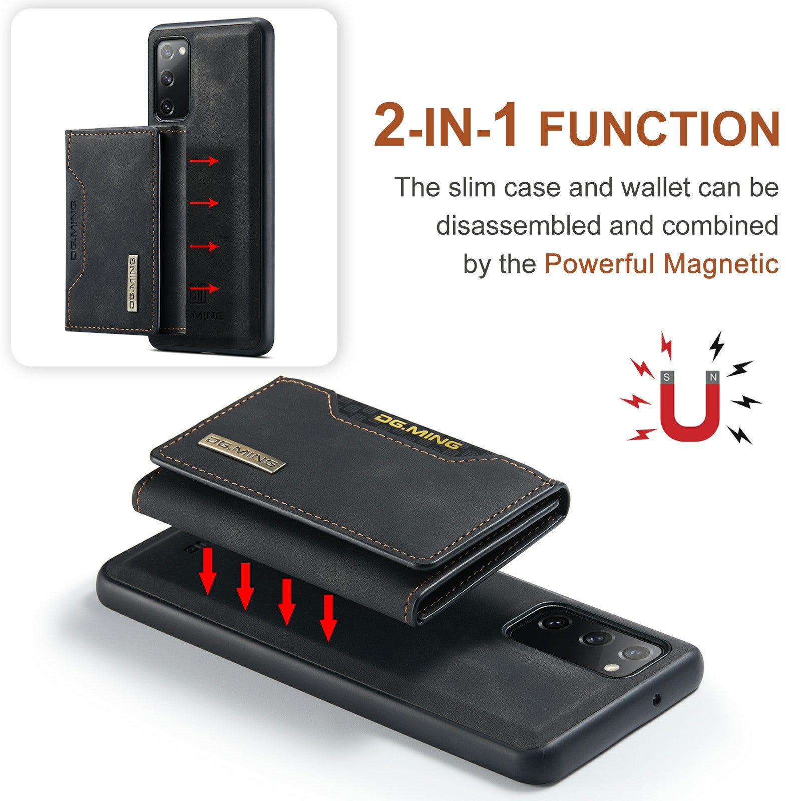 DG.MING M2 Series Magnetic Detachable Hybrid Case with Tri-Fold Wallet Kickstand Design for Samsung Galaxy S20 FE 2022/S20 FE 4G/S20 FE 5G/S20 Lite - Black