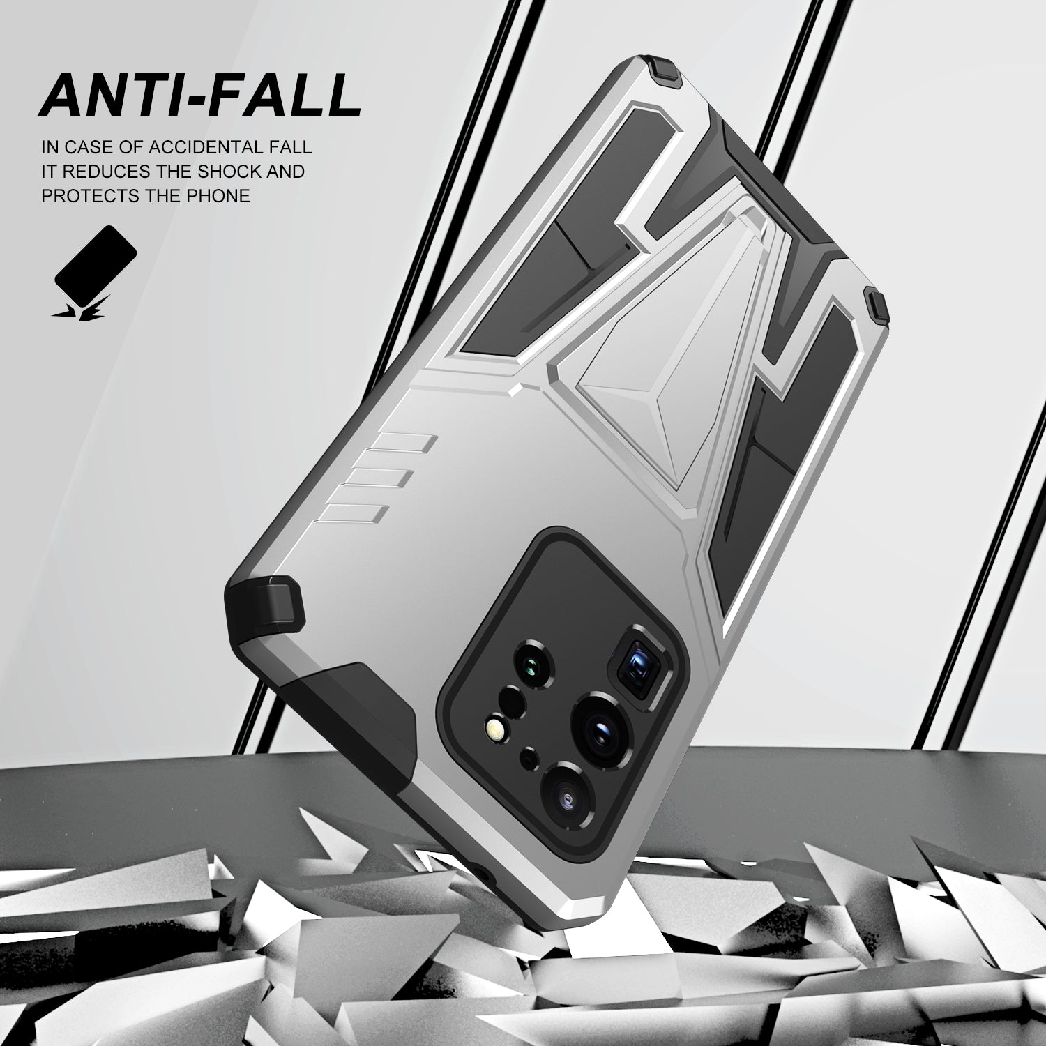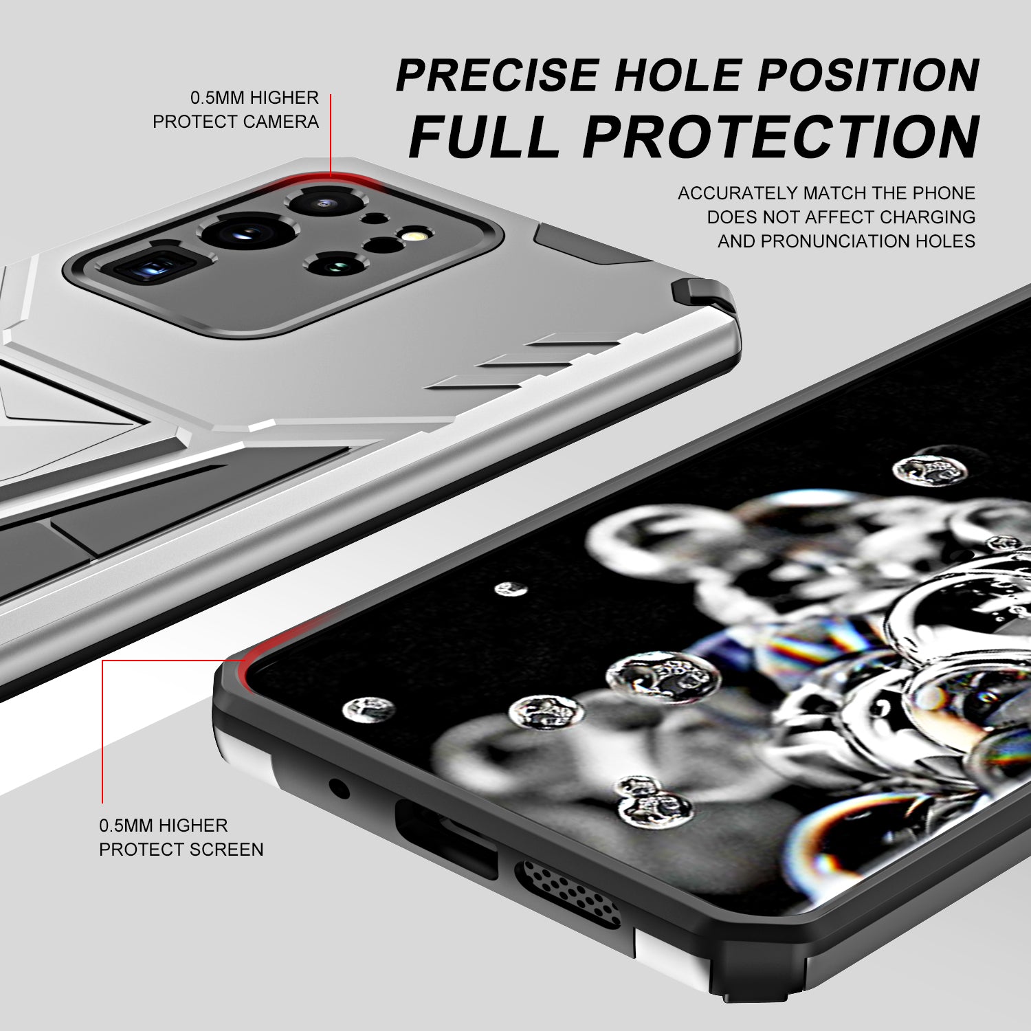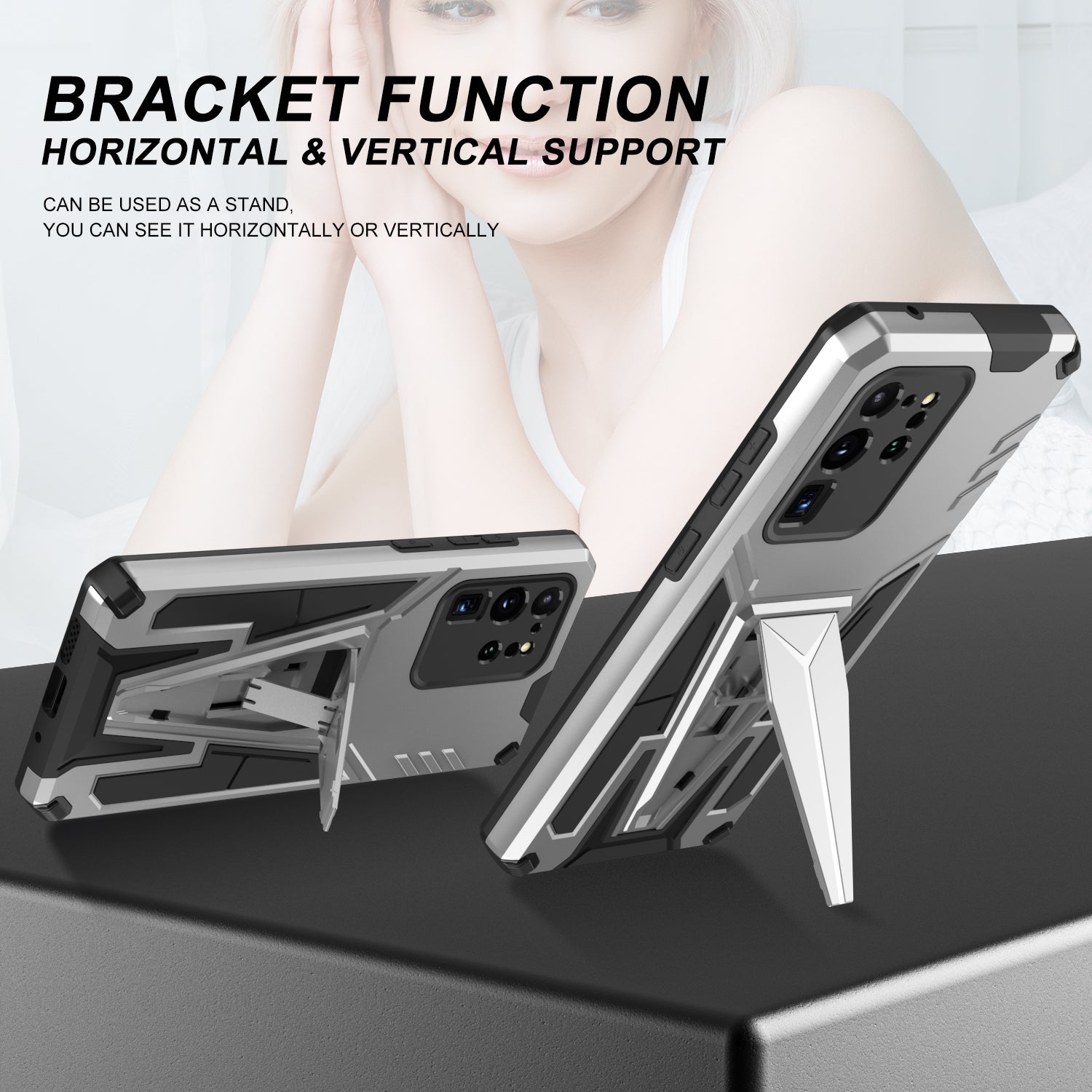 Dual-Layer Shock-Absorption V-Shaped Armor Hard PC + Flexible TPU Protective Case with Kickstand for Samsung Galaxy S20 Ultra - Silver