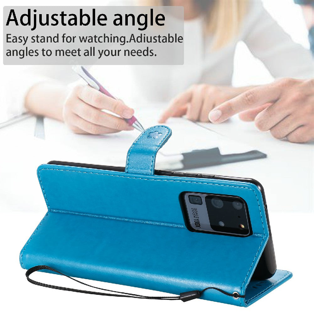 Folio Book Style KT Imprinting Flower Series-4 Cat and Bee Pattern Imprinting Leather Wallet Stand Case with Strap for Samsung Galaxy S20 Ultra - Blue
