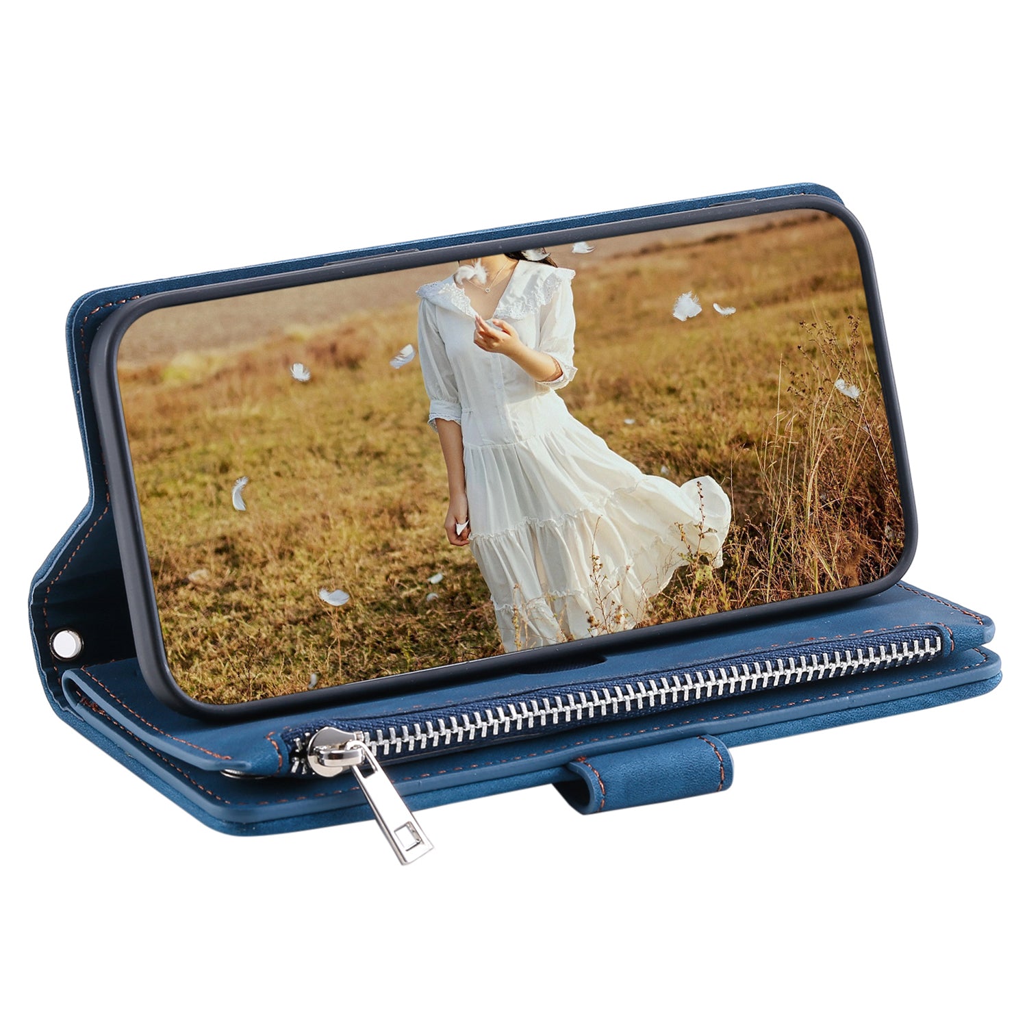 Uniqkart for iPhone 15 Anti-Dust PU Leather Phone Case Rhombus Texture Zipper Wallet Cover with Strap - Blue