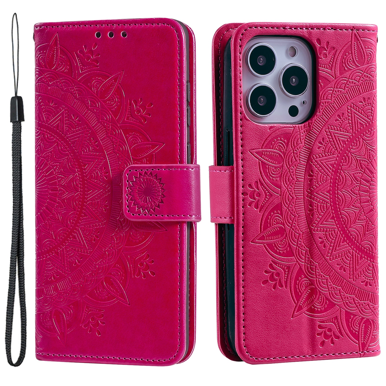 Uniqkart for iPhone 15 Ultra Mandala Flower Imprint Phone Case PU Leather Wallet Stand Folio Cover with Strap - Rose