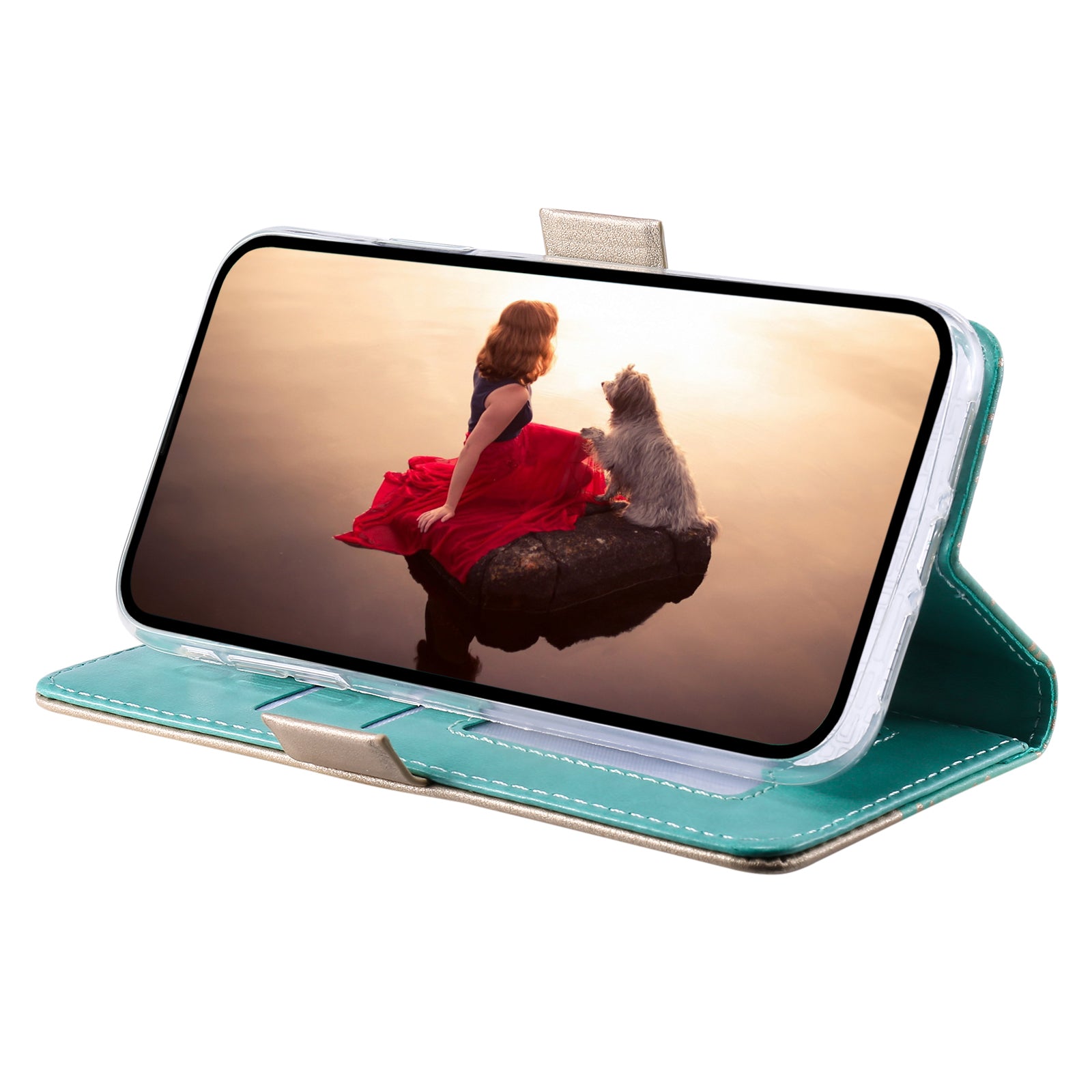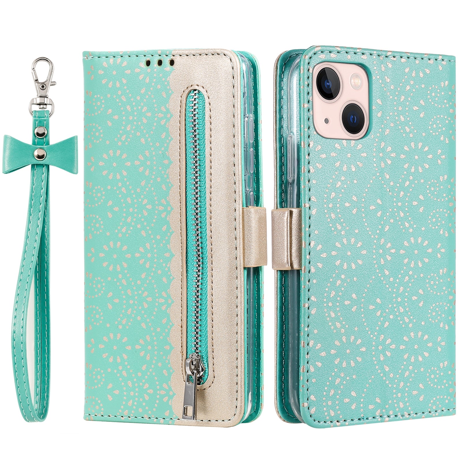 Uniqkart for iPhone 15 Zipper Wallet Phone Case Lace Flower Pattern Stand Leather Cover with Bowknot Wrist Strap - Green