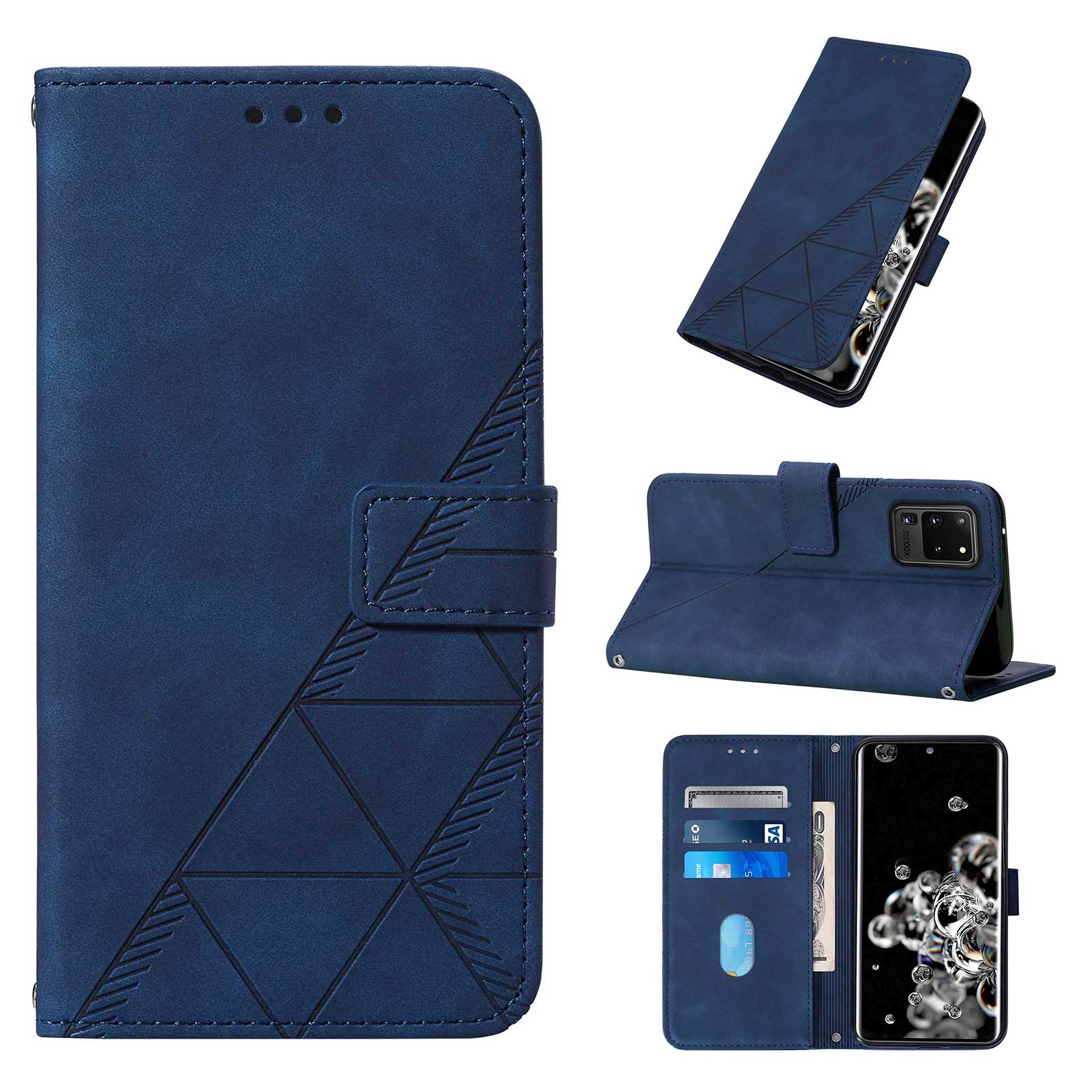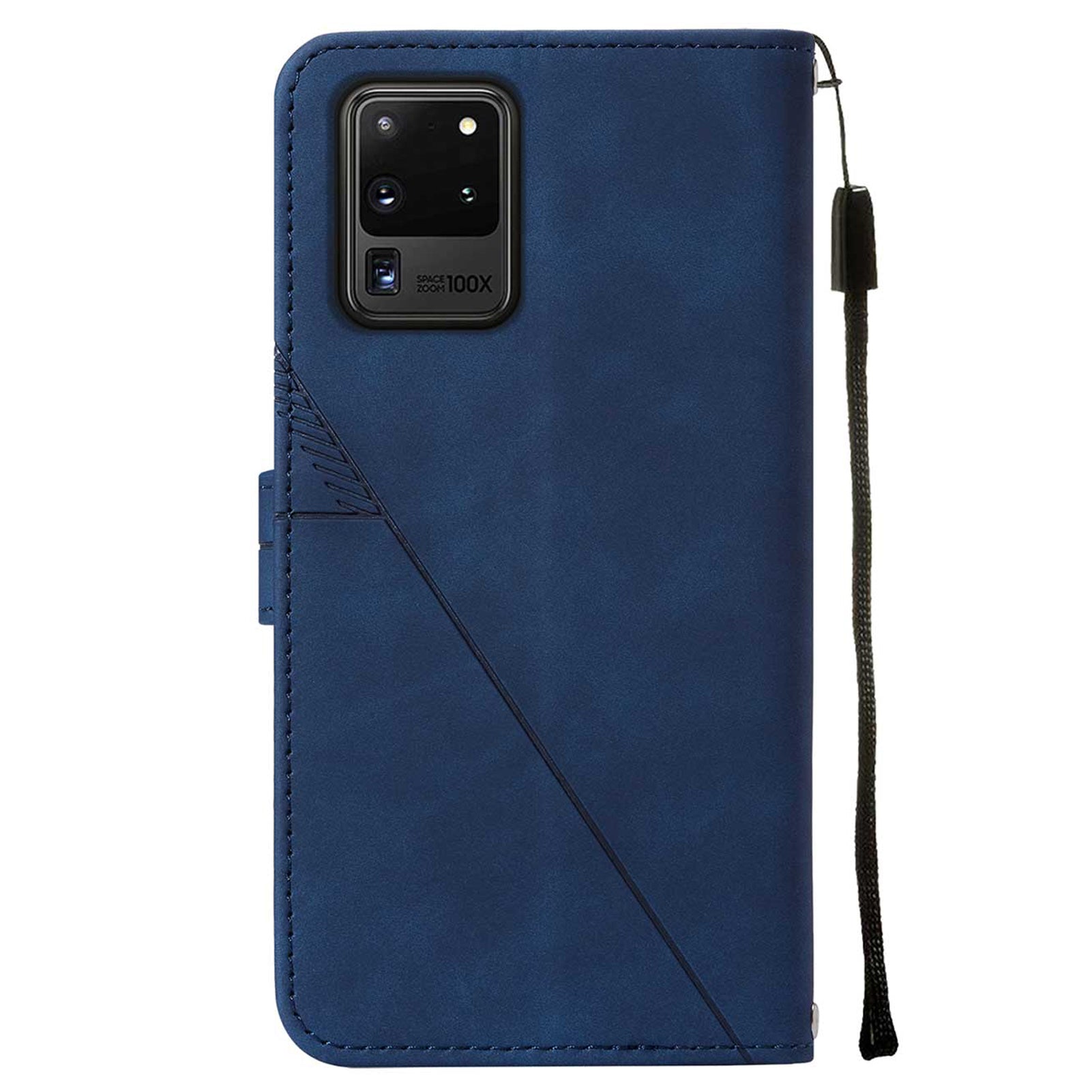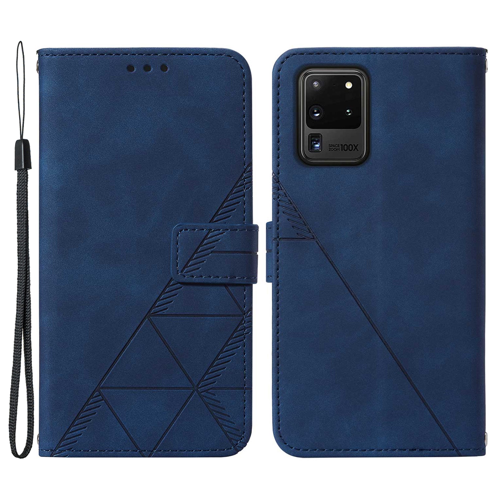 Imprinting Lines PU Leather Folio Flip Wallet Case Stand Magnetic Closure TPU Interior Phone Cover with Strap for Samsung Galaxy S20 Ultra - Sapphire