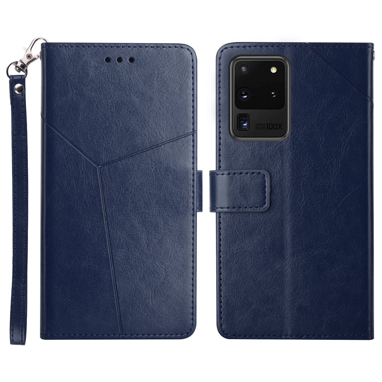 Imprinting Y-shaped Line Leather Wallet Stand Phone Cover with Wrist Strap for Samsung Galaxy S20 Ultra - Blue