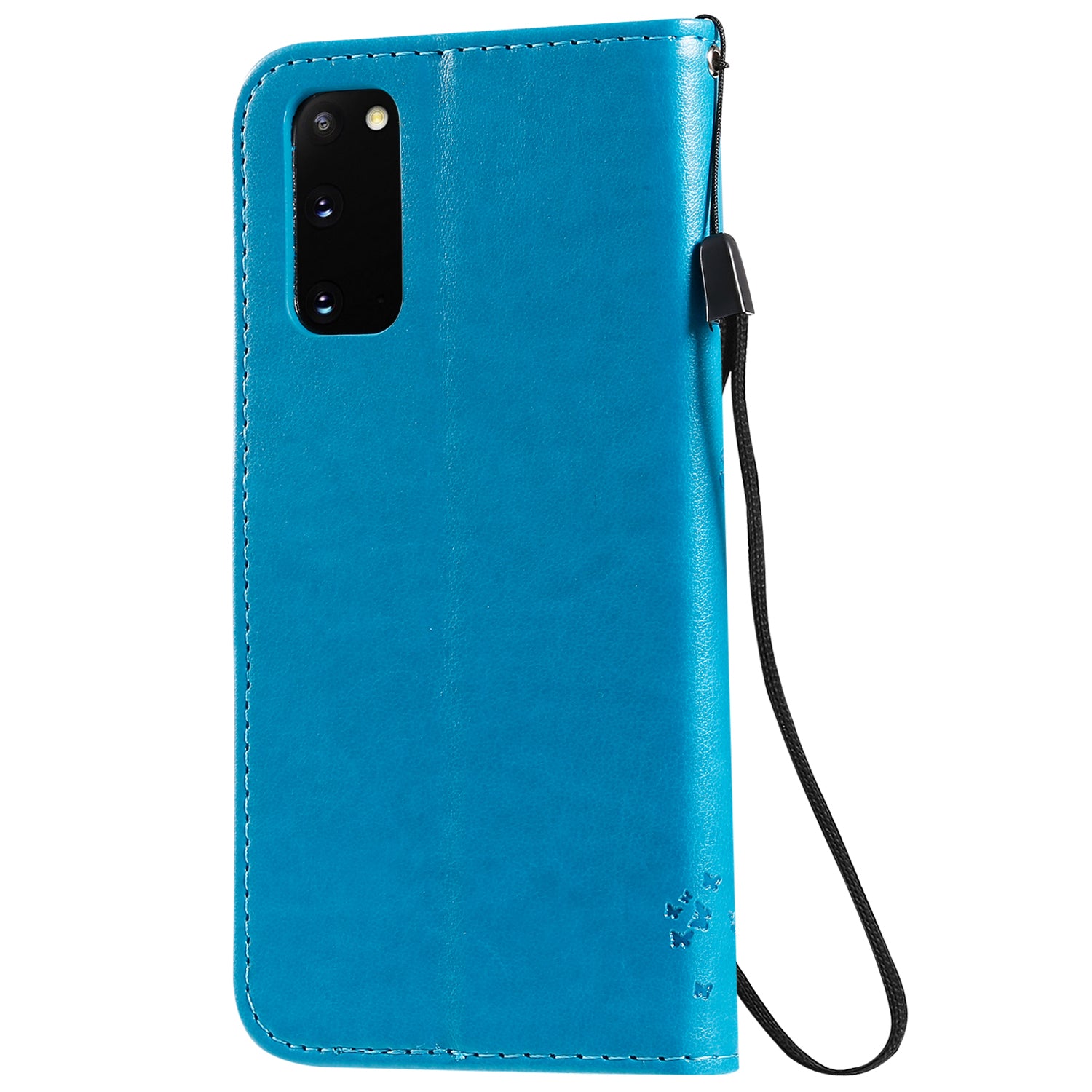 KT Imprinting Flower Series-3 Cat and Tree Imprinting Adjustable Stand Design Leather Cover + TPU Inner Phone Wallet Case for Samsung Galaxy S20 4G/S20 5G - Blue
