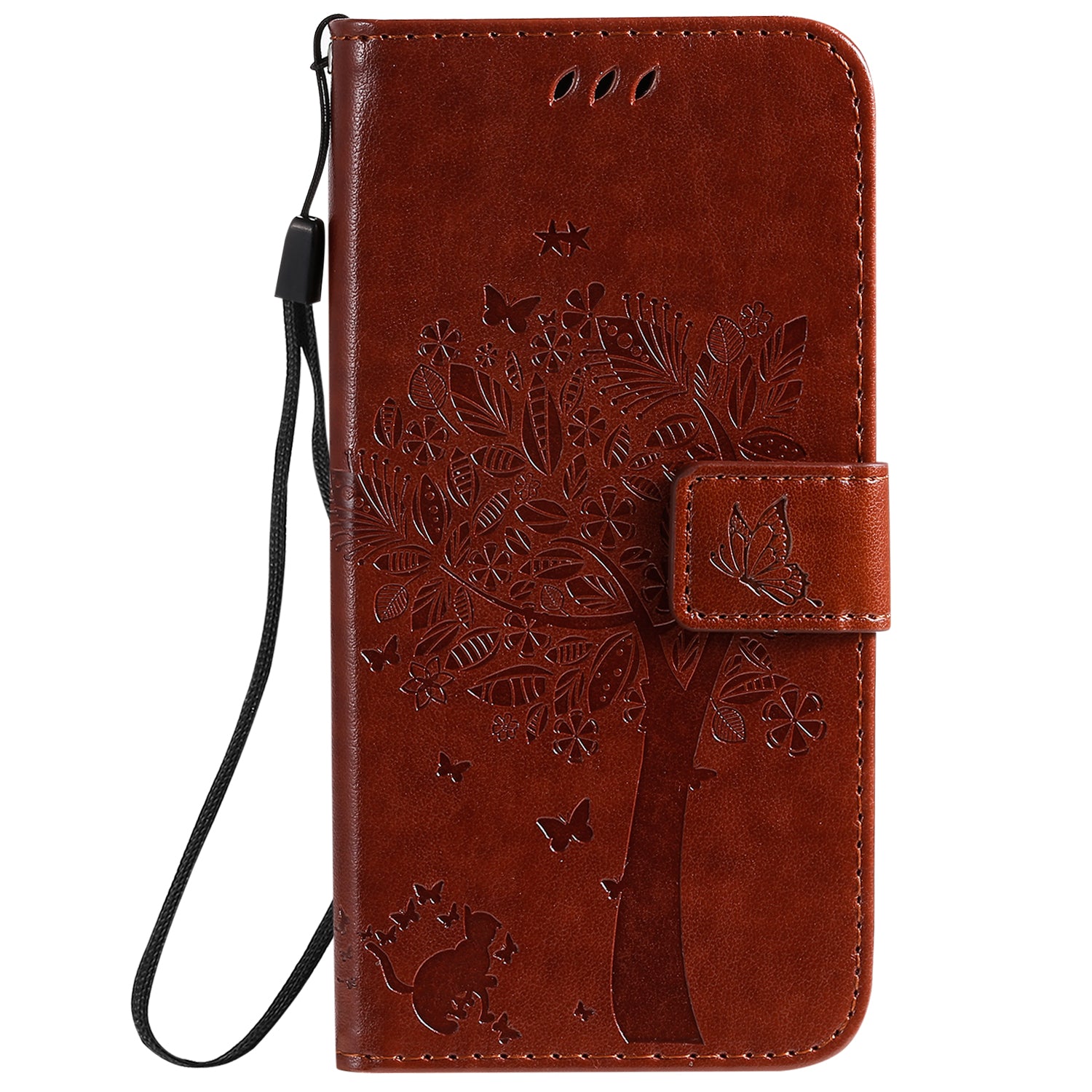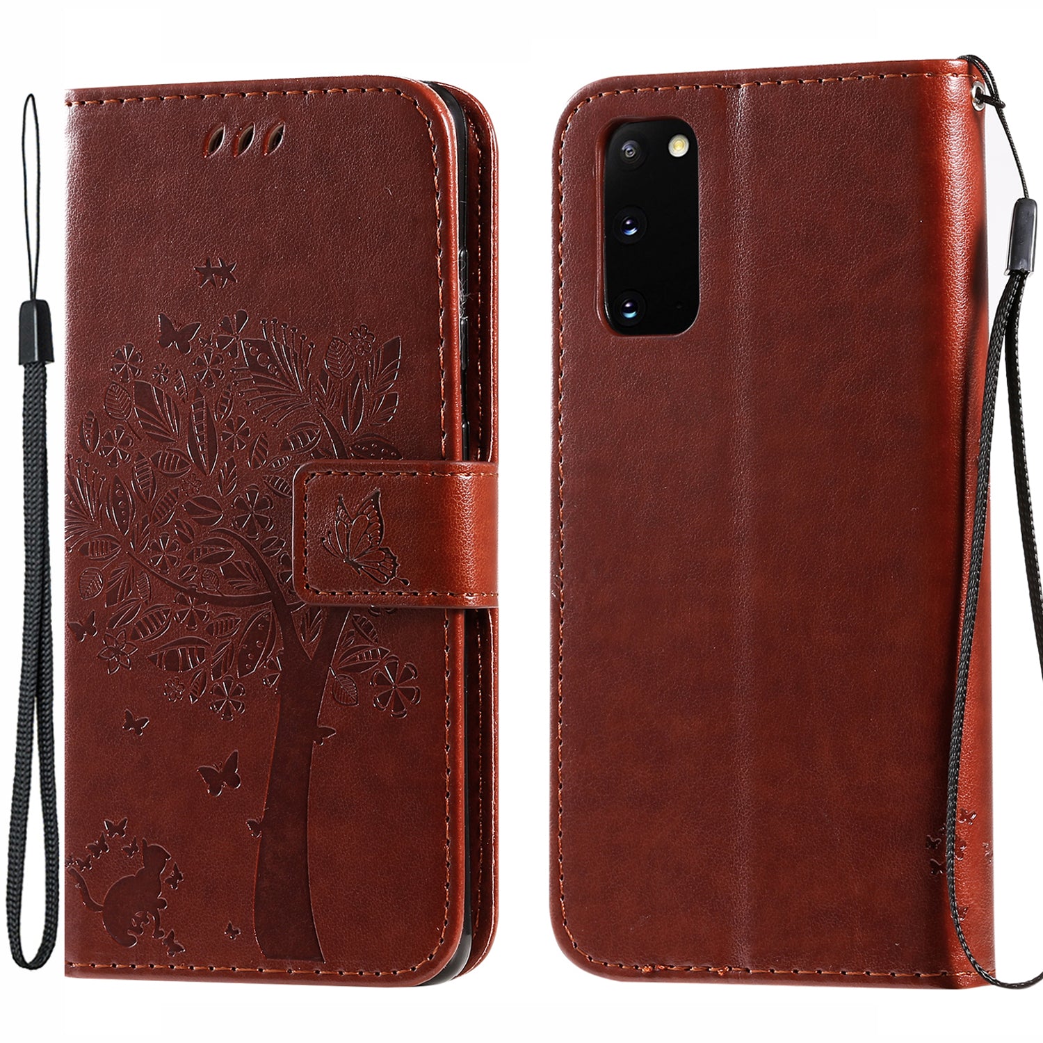 KT Imprinting Flower Series-3 Cat and Tree Imprinting Adjustable Stand Design Leather Cover + TPU Inner Phone Wallet Case for Samsung Galaxy S20 4G/S20 5G - Coffee