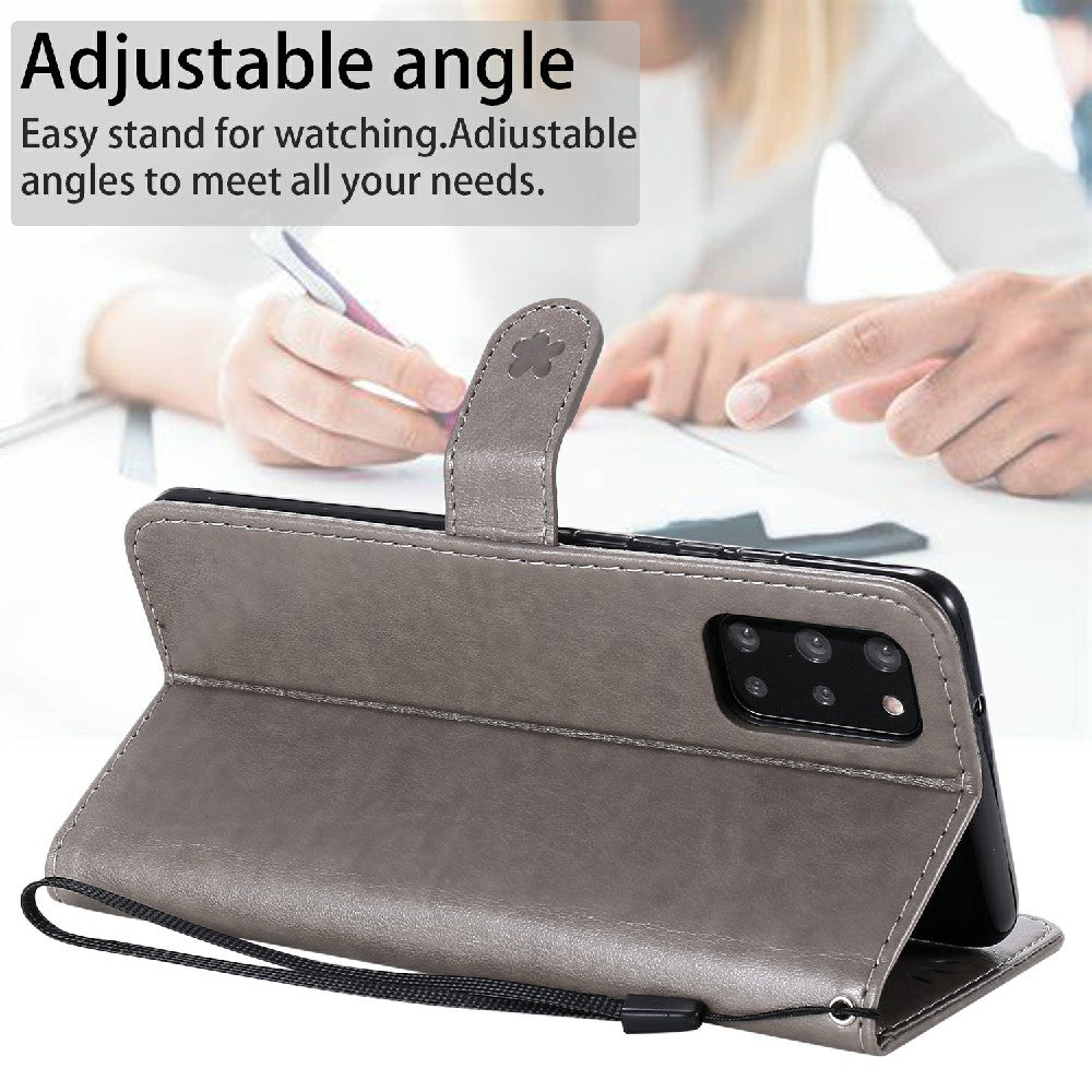 KT Imprinting Flower Series-4 Cat and Bee Pattern Imprinted Protective Cover Stand Wallet Leather Case for Samsung Galaxy S20 Plus 4G/5G - Grey