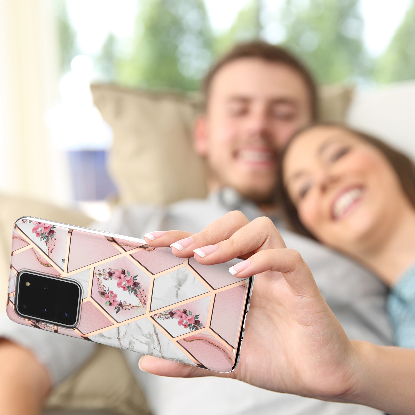 Light Slim Marble Design Electroplating Skin Touch IMD IML Soft TPU Phone Case Cover for Samsung Galaxy S20 Ultra - Pink Flowers