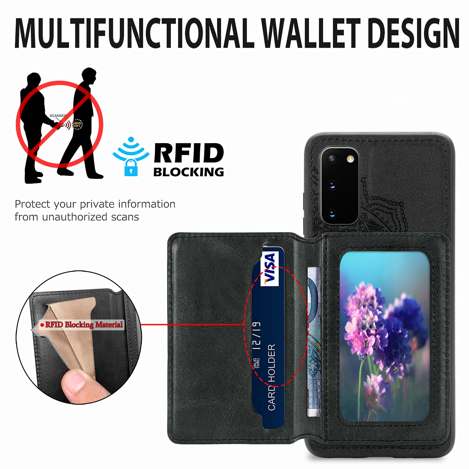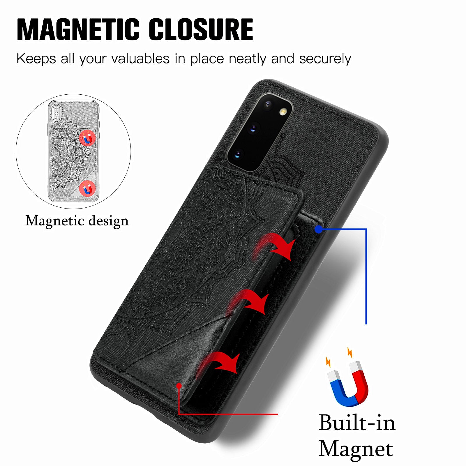 Magnetic Auto-absorbed Kickstand Leather Coated Phone Case Cover with Imprinted Mandala Flower for Samsung Galaxy S20 4G/S20 5G - Black