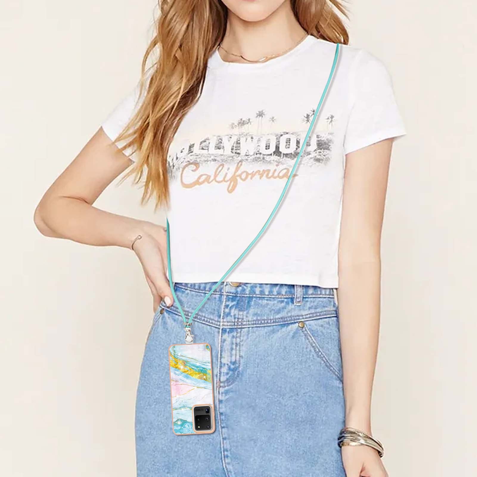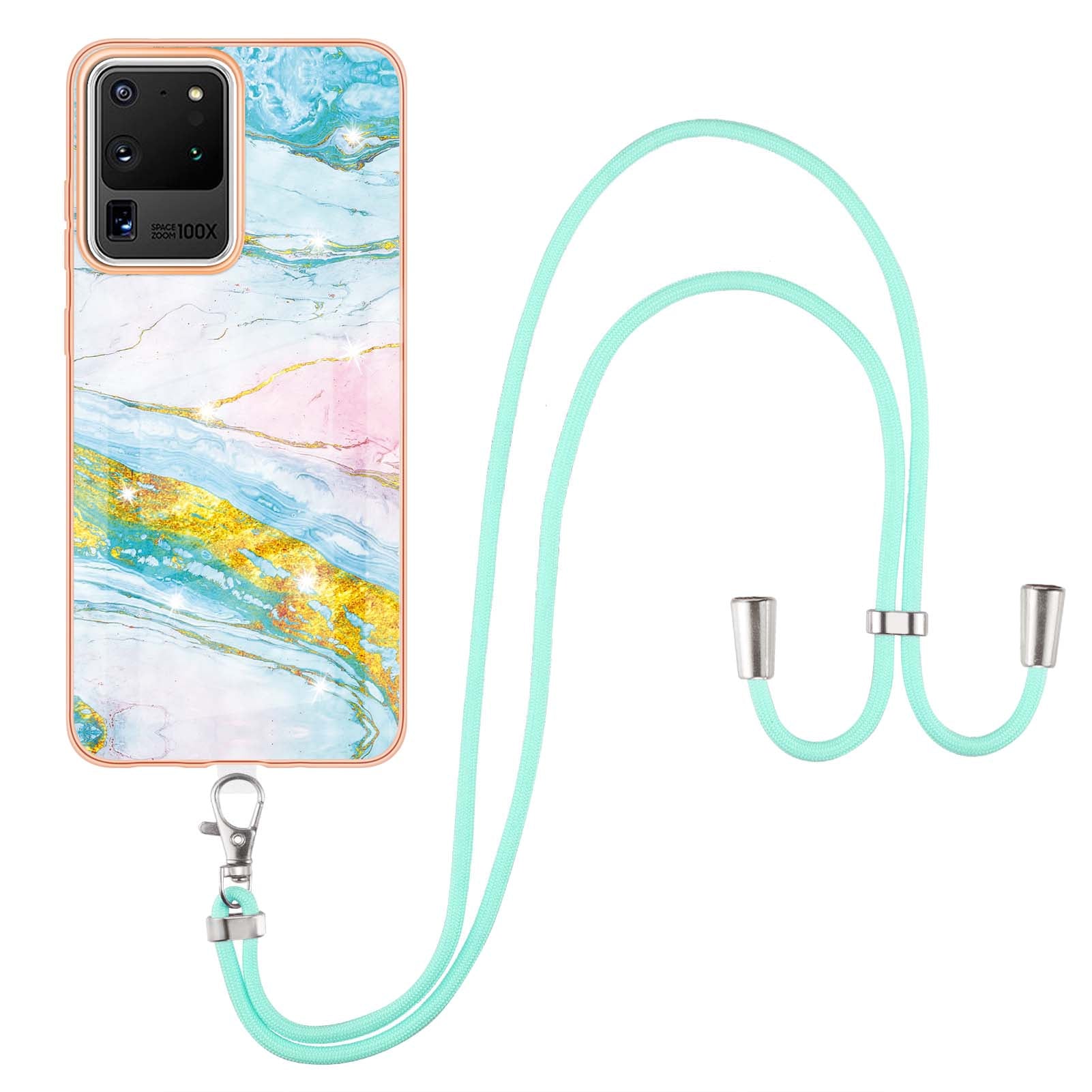 Marble Pattern Electroplated Edge Flexible TPU Anti-Drop IMD Phone Case with Strap for Samsung Galaxy S20 Ultra - Green 004