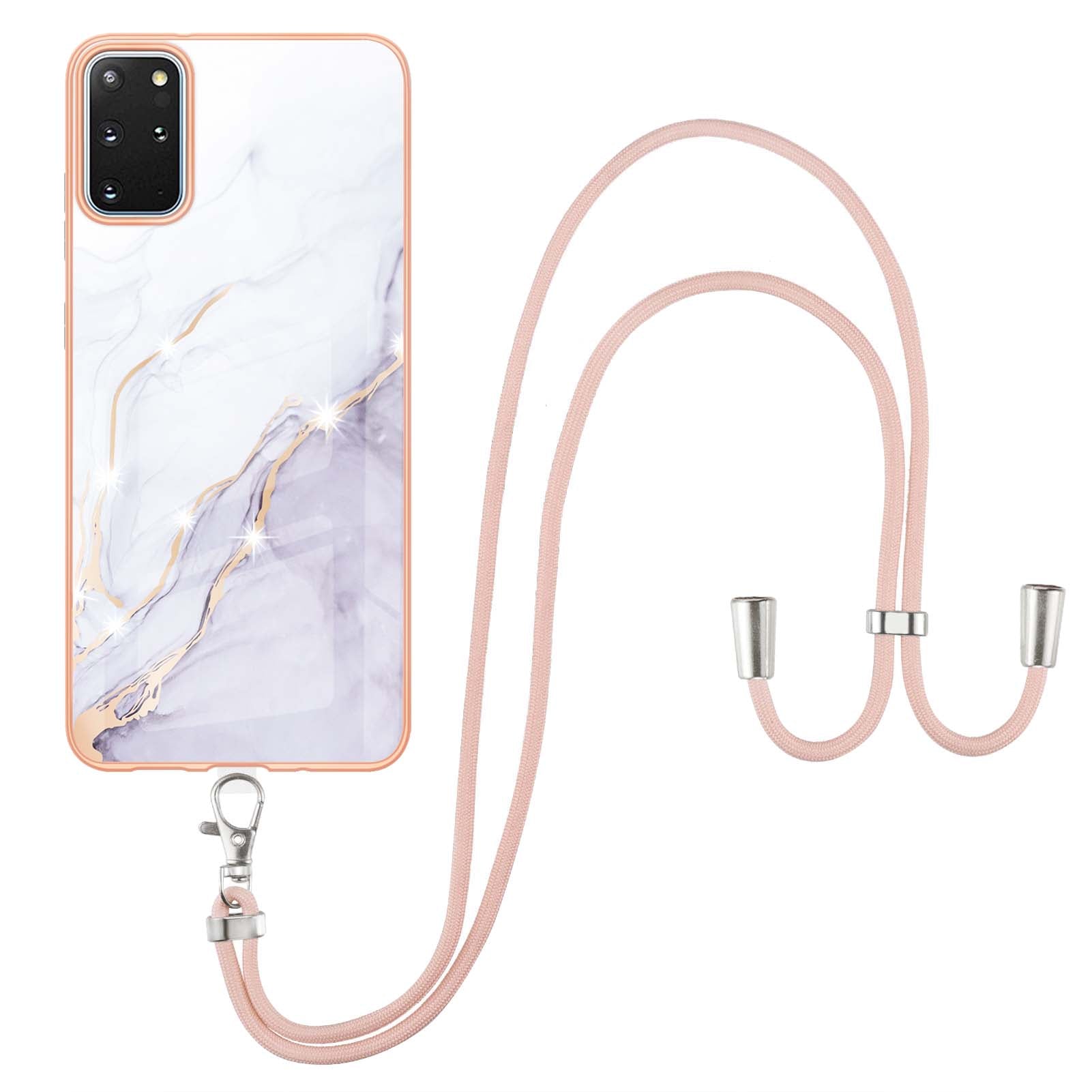 Marble Pattern Electroplated Edge Flexible TPU IMD Stylish Shockproof Phone Shell with Strap for Samsung Galaxy S20 Plus 4G/5G - White 006