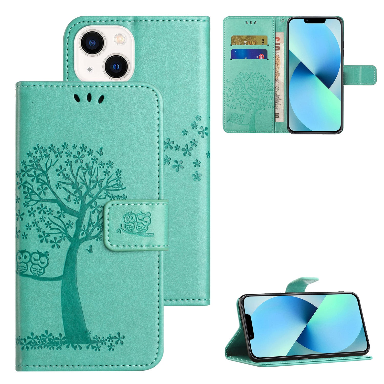 Phone Leather Case for iPhone 15 , Stand Wallet Owl Tree Imprinted Full Protection Phone Cover - Cyan