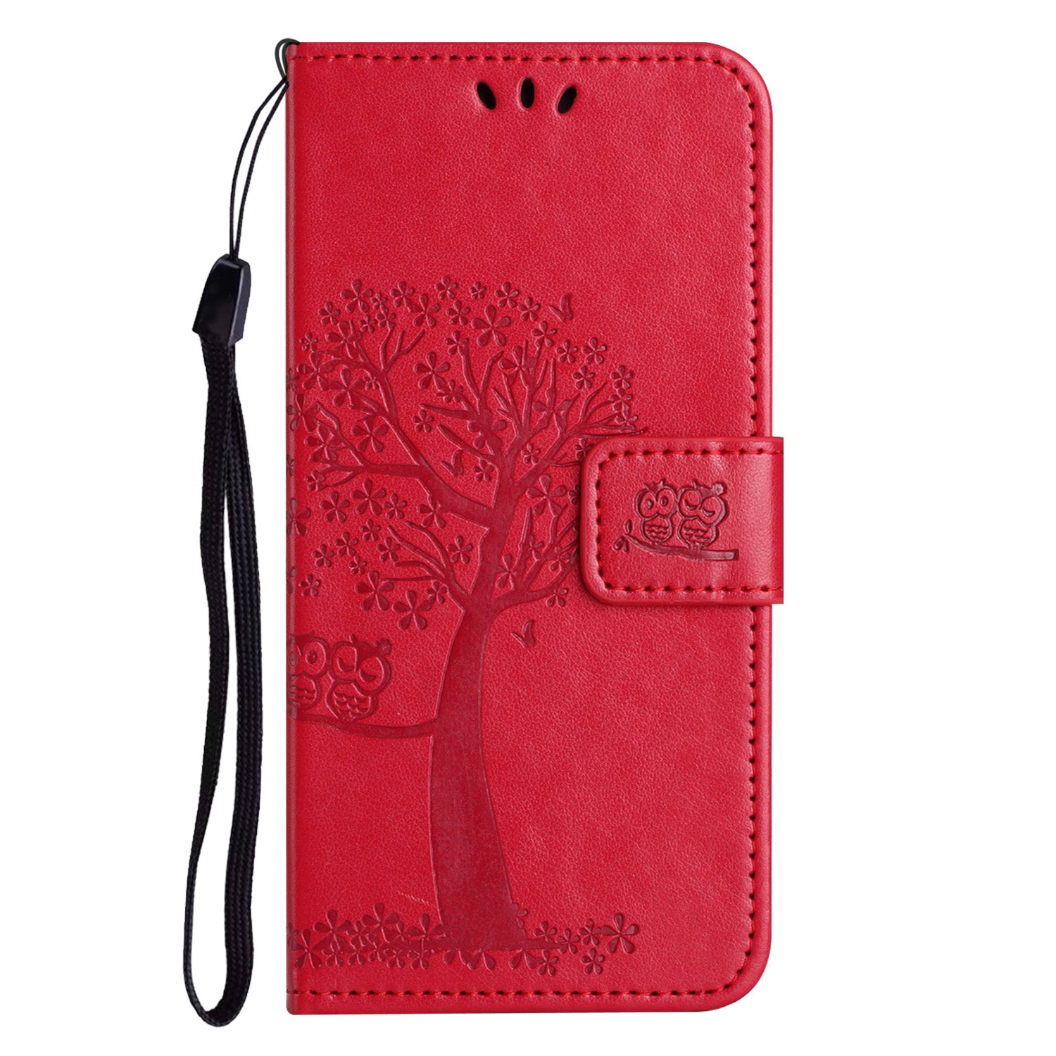 Phone Leather Case for iPhone 15 , Stand Wallet Owl Tree Imprinted Full Protection Phone Cover - Red