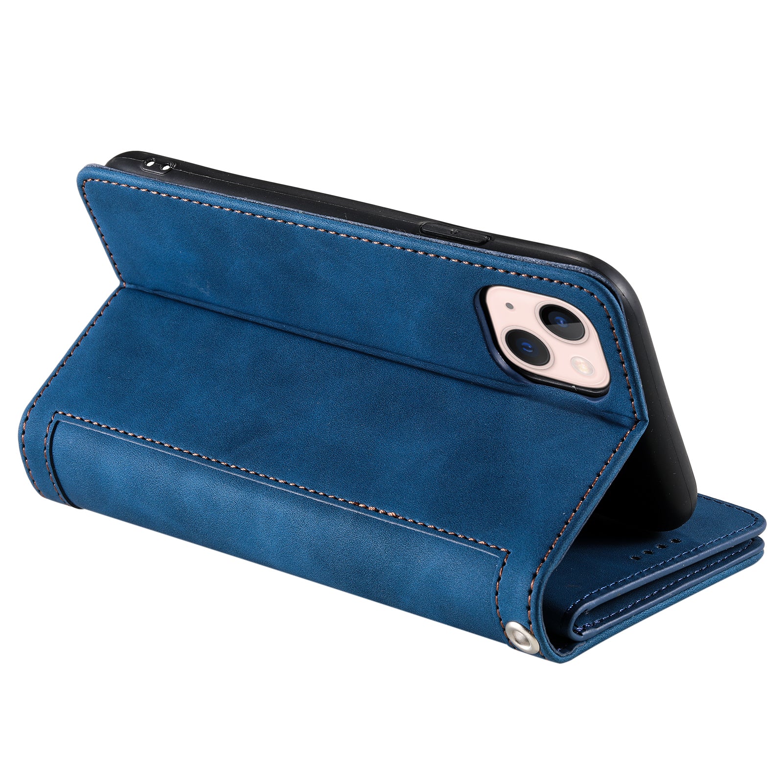 PU Leather Phone Case for iPhone 15 Protective Case Zipper Pocket 9 Card Slots Phone Cover with Strap - Blue