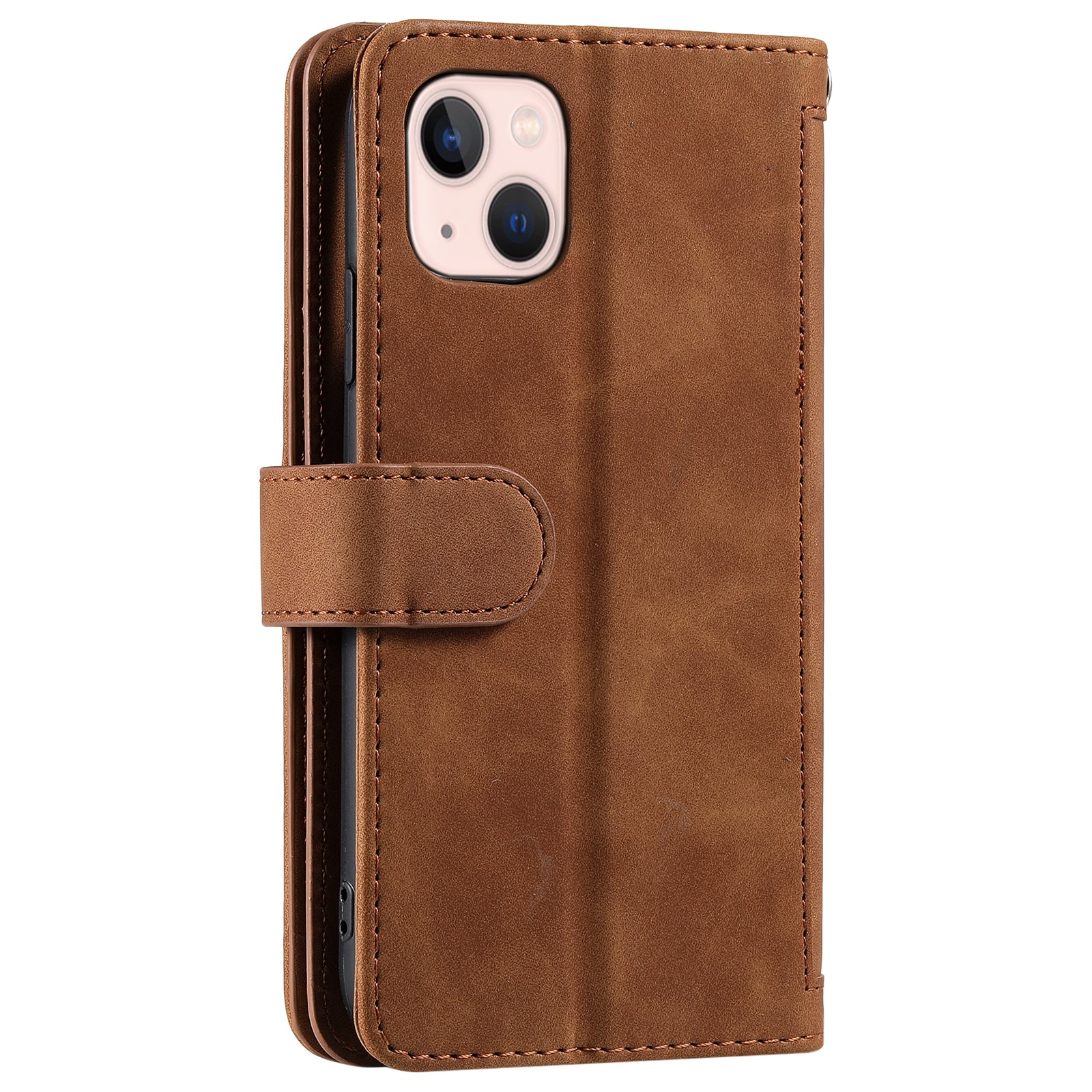 PU Leather Phone Case for iPhone 15 Protective Case Zipper Pocket 9 Card Slots Phone Cover with Strap - Brown