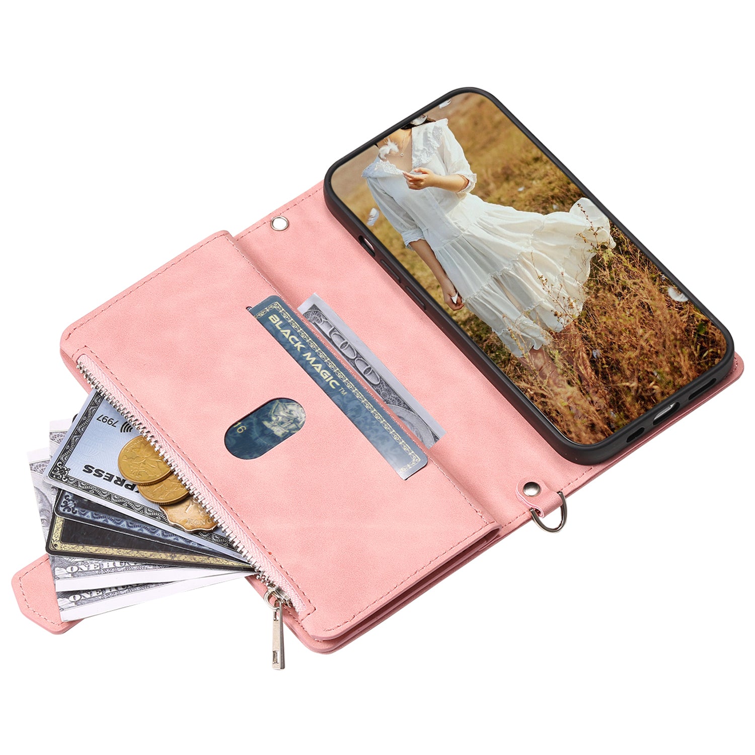 PU Leather Phone Case for iPhone 15 Ultra Rhombus Pattern Imprinted Zipper Pocket Wallet Stand Cover with Strap - Rose Gold