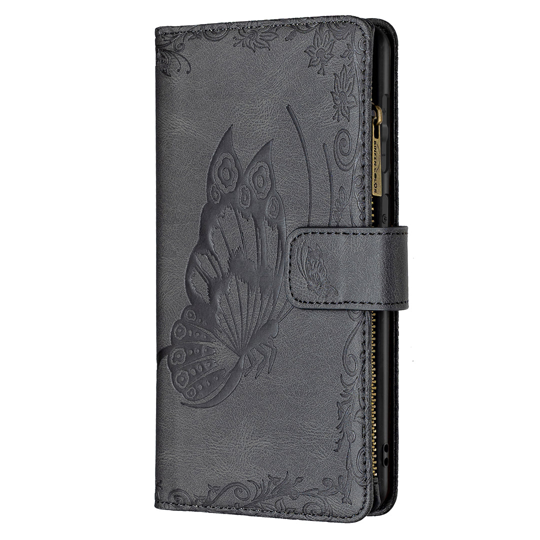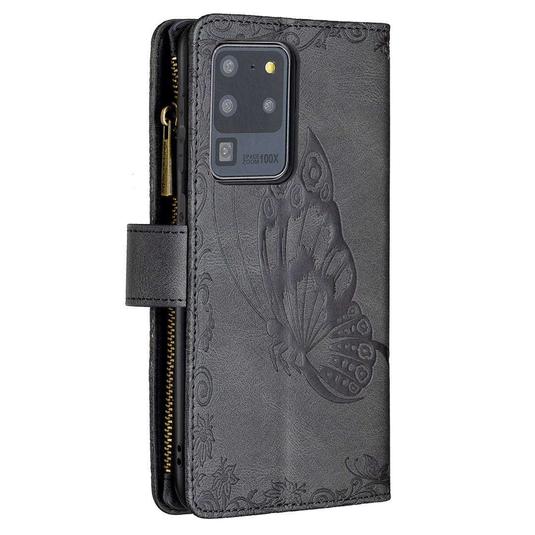 PU Leather Wallet Case for Samsung Galaxy S20 Ultra, Zipper Pocket Pattern Stand Flip Phone Cover - Black