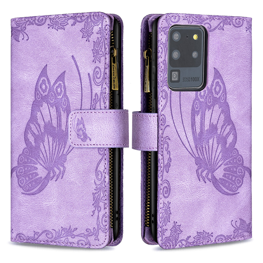 PU Leather Wallet Case for Samsung Galaxy S20 Ultra, Zipper Pocket Pattern Stand Flip Phone Cover - Purple