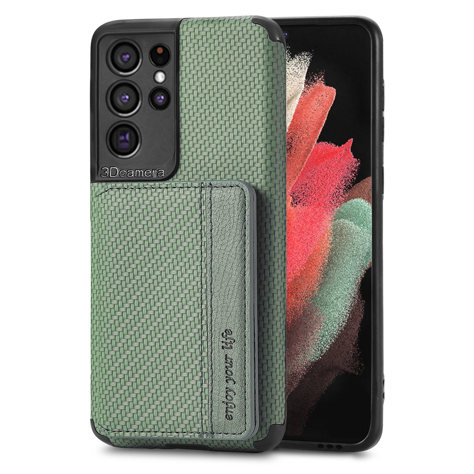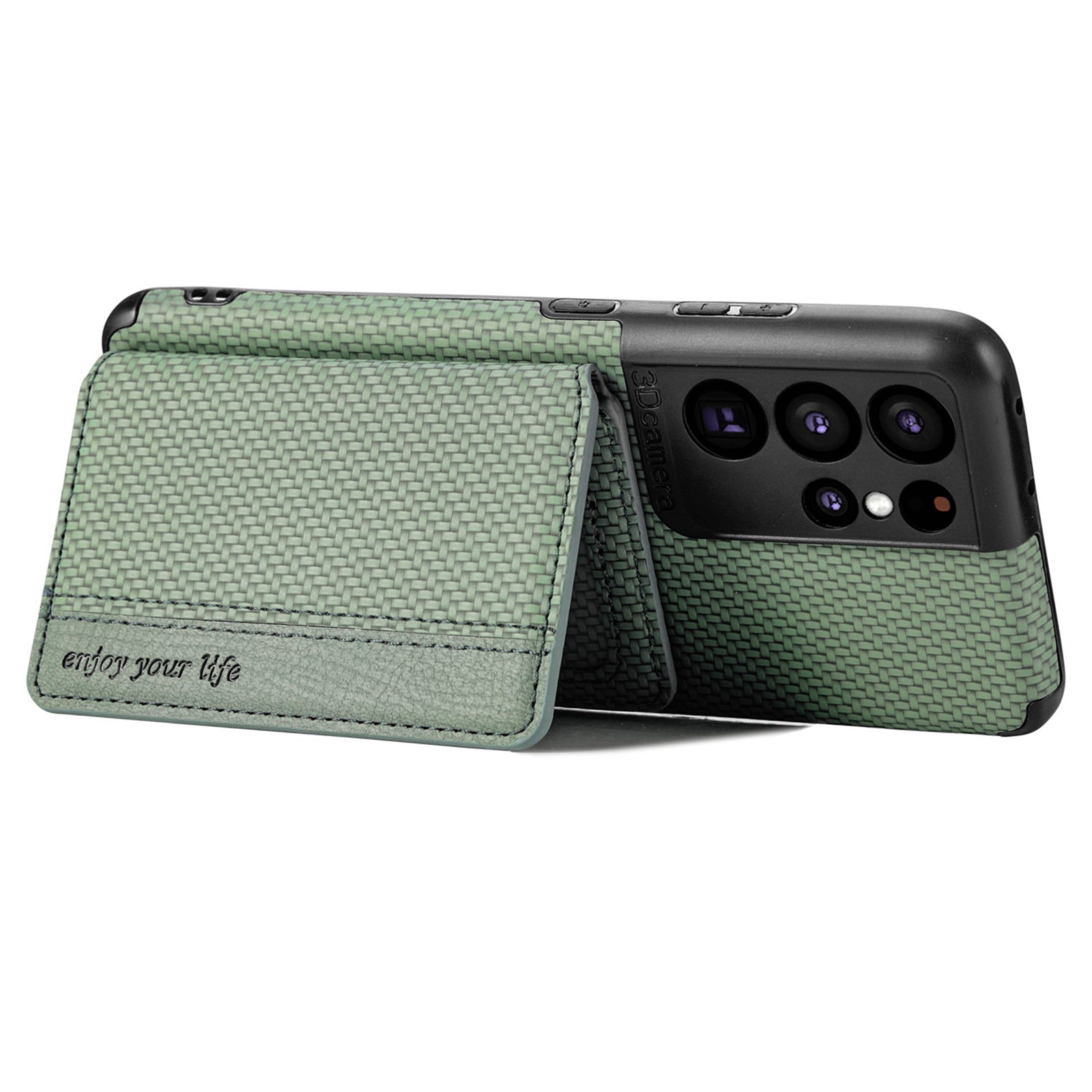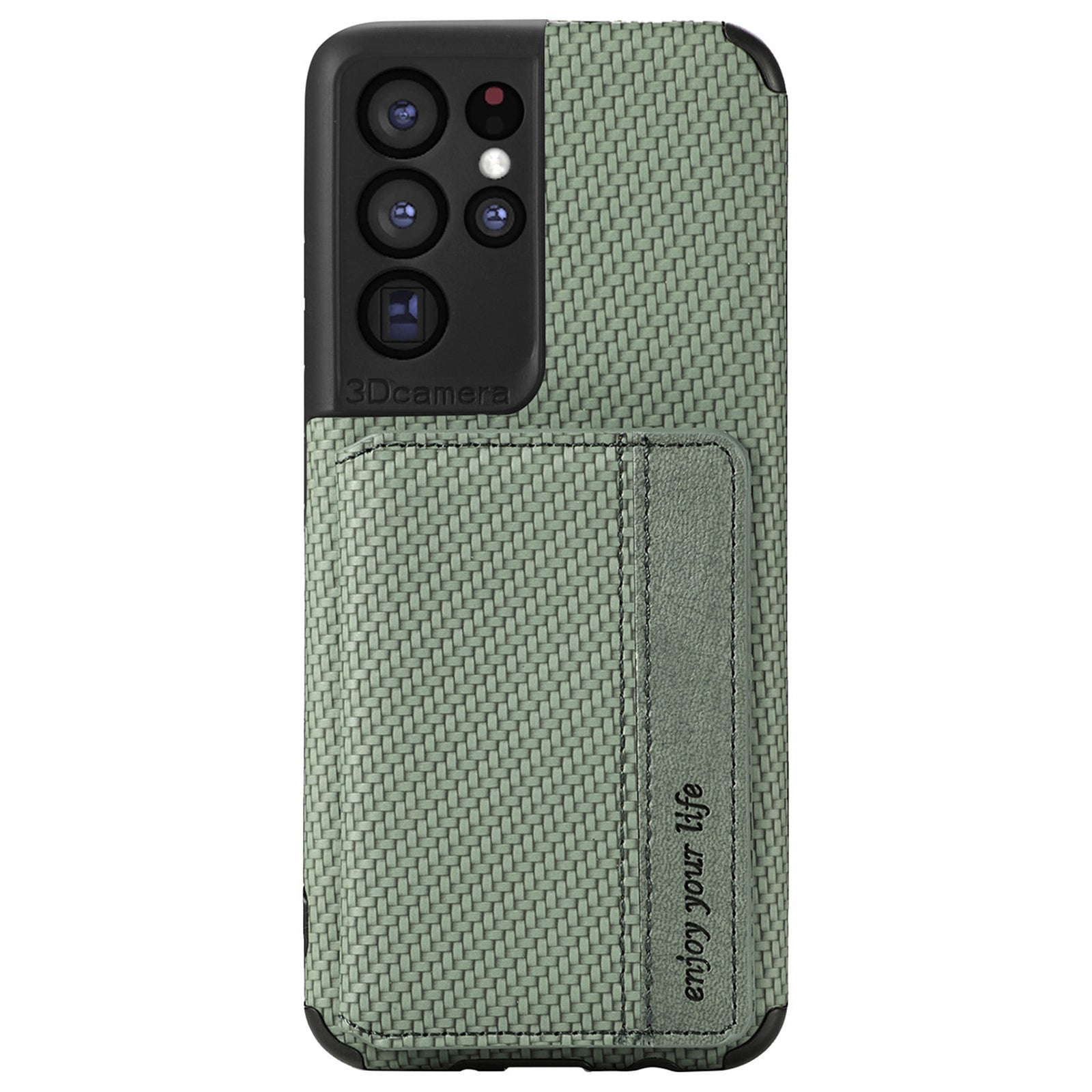 Quality Leather and TPU Phone Case Carbon Fiber Texture Anti-Drop Card Holder Design Built-in Magnet Metal Sheet Phone Cover with Kickstand for 	Samsung Galaxy S20 Ultra - Green