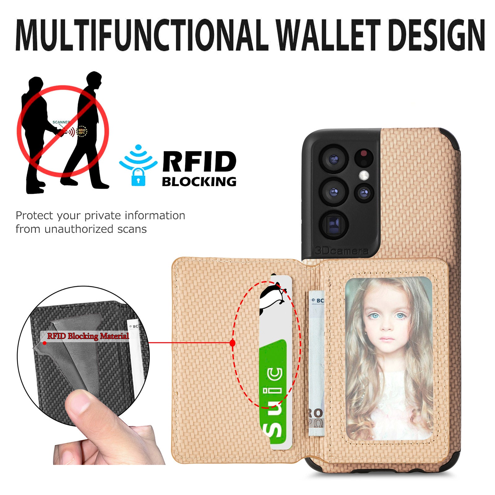 Quality Leather and TPU Phone Case Carbon Fiber Texture Anti-Drop Card Holder Design Built-in Magnet Metal Sheet Phone Cover with Kickstand for 	Samsung Galaxy S20 Ultra - Khaki