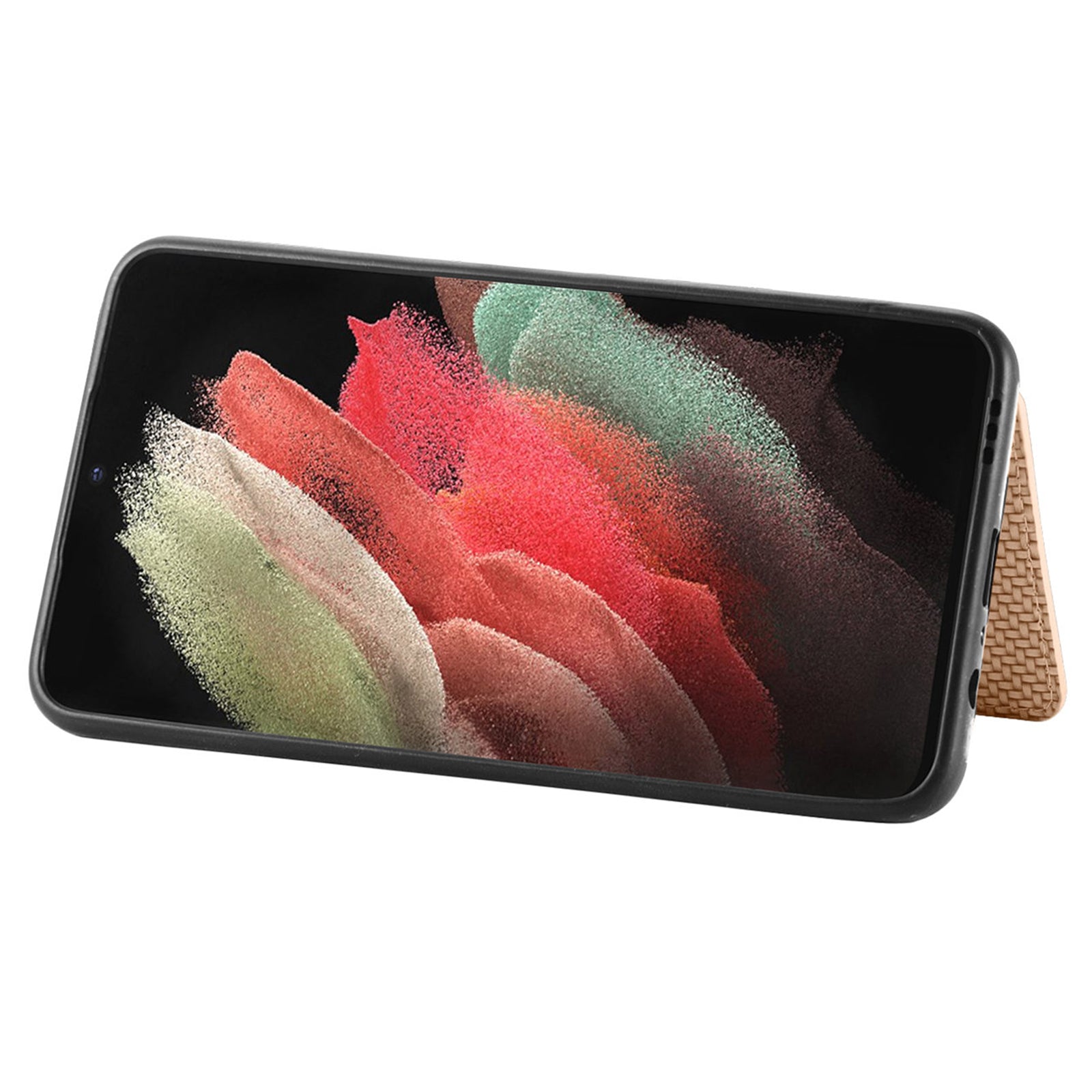 Quality Leather and TPU Phone Case Carbon Fiber Texture Anti-Drop Card Holder Design Built-in Magnet Metal Sheet Phone Cover with Kickstand for Samsung Galaxy S20 Ultra - Khaki