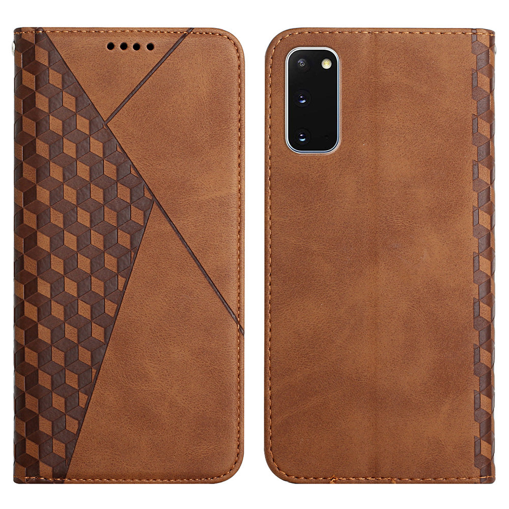 Rhombus Pattern Auto-absorbed Skin-touch Full-Protection Leather Wallet Cell Phone Stand Cover Case for Samsung Galaxy S20 4G/S20 5G - Brown