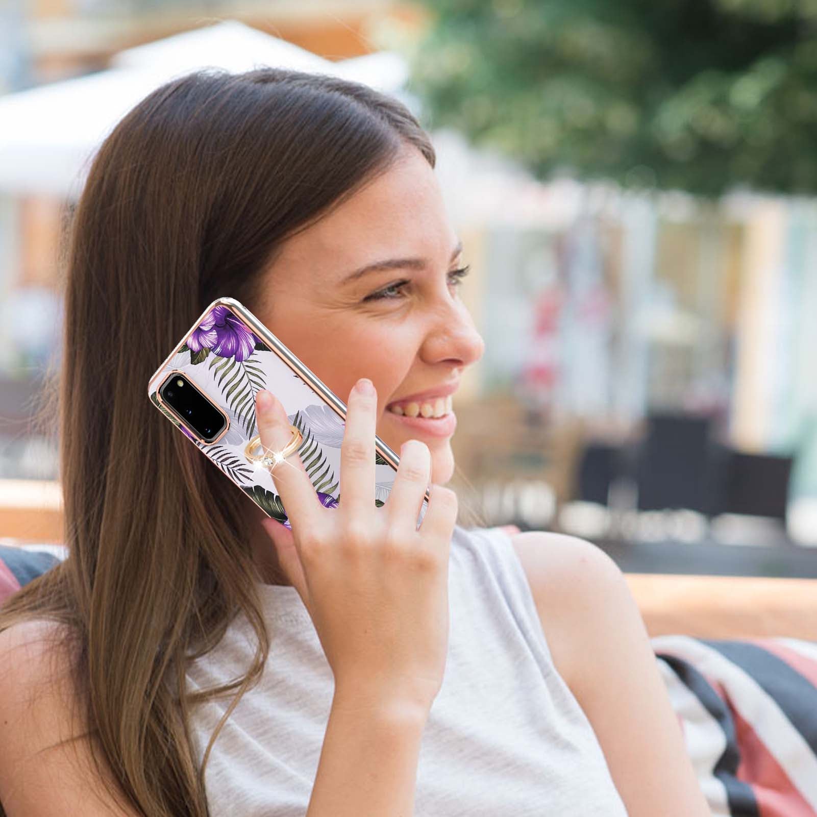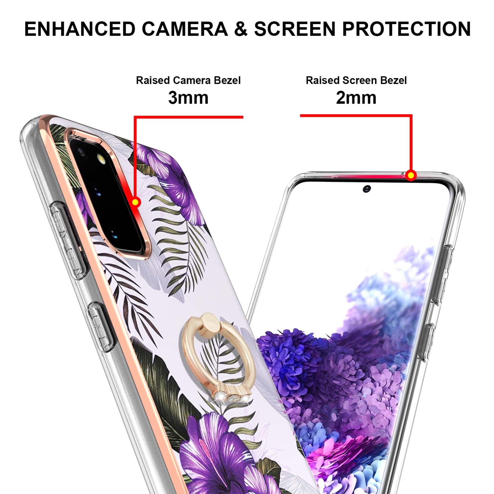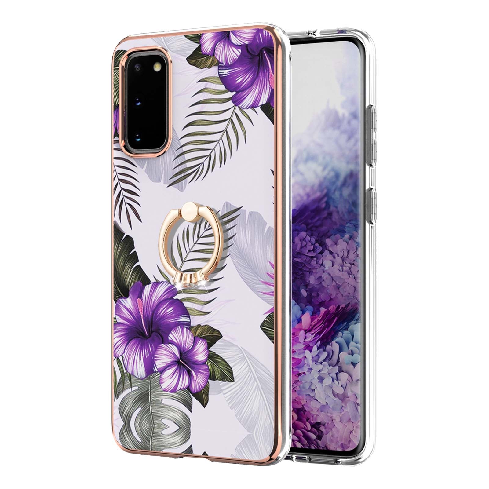 Ring Holder Kickstand Marble Pattern Shockproof TPU IMD Protective Case for Samsung Galaxy S20 4G/S20 5G - Purple Flowers