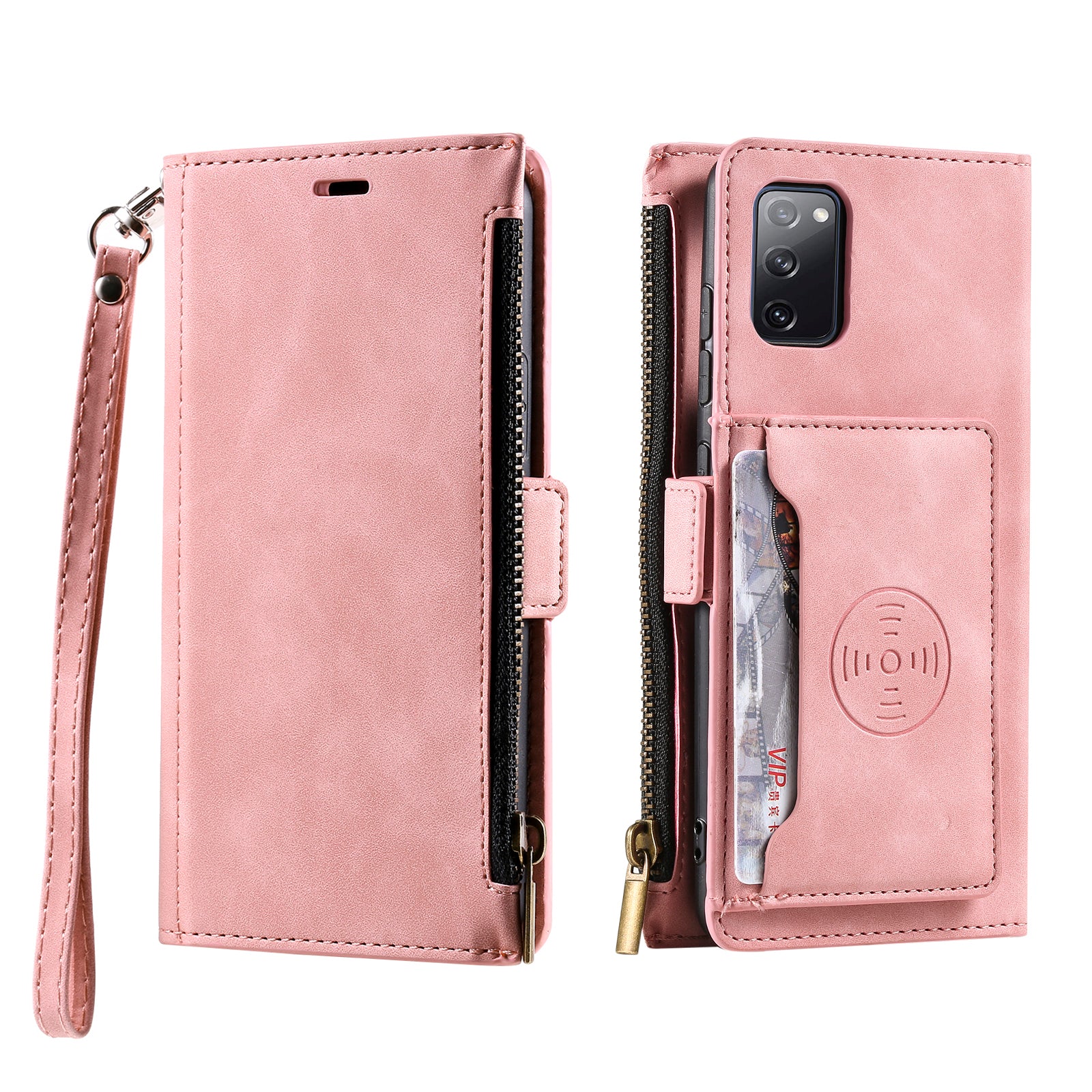 Shockproof PU Leather Zipper Pocket Flip Kickstand Wallet Case with Wrist Strap for Samsung Galaxy S20 FE 2022/S20 FE 4G/S20 FE 5G/S20 Lite - Pink