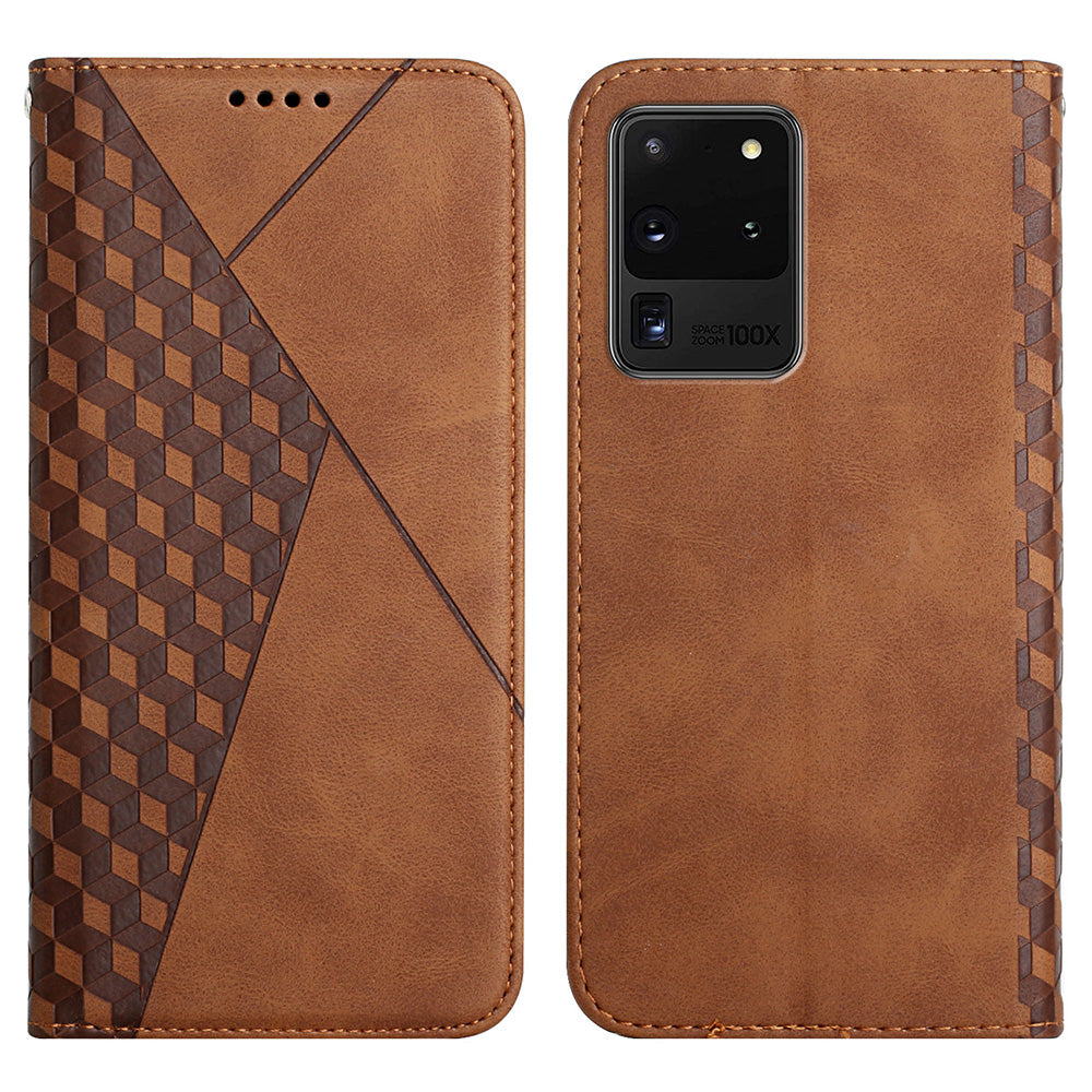 Skin-touch Feel Geometric Pattern Magnetic Absorption Leather Case Stand Wallet Shell for Samsung Galaxy S20 Ultra - Brown