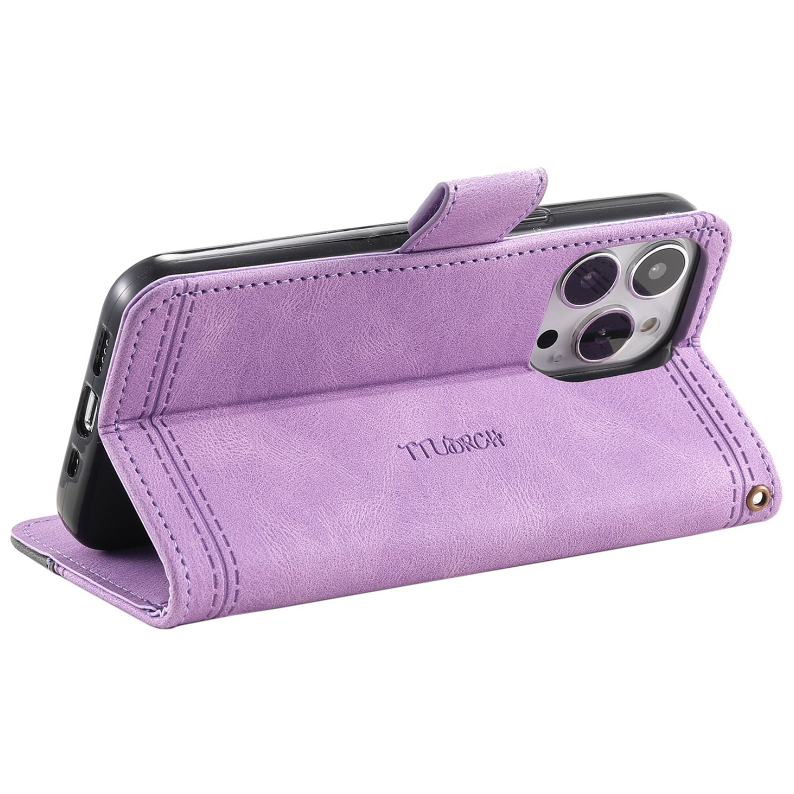 Uniqkart For iPhone 15 Pro Style 004 Wrist Strap Design Splicing Skin-touch Leather Case RFID Blocking Wallet Stand Cover - Purple