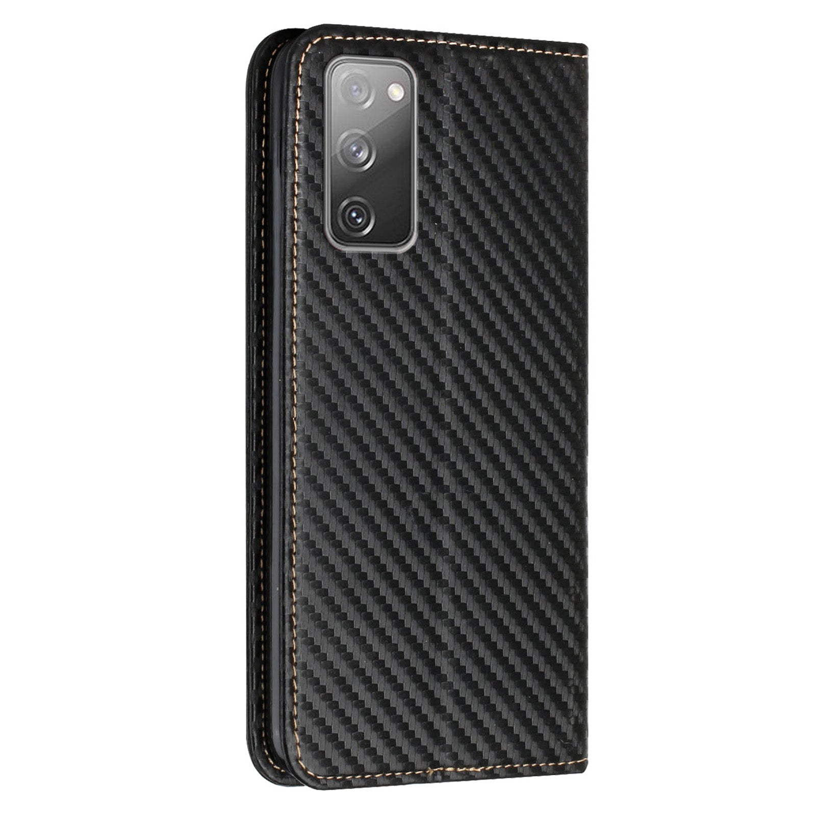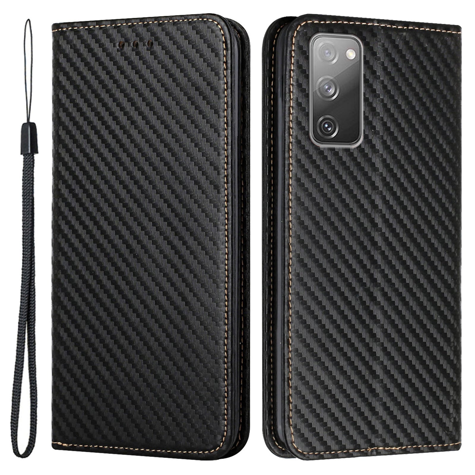 Wallet Design Carbon Fiber Texture Stand Auto-absorbed Leather Case Cover with Hand Strap for Samsung Galaxy S20 FE 2022/S20 FE 4G/5G/S20 Lite - Black