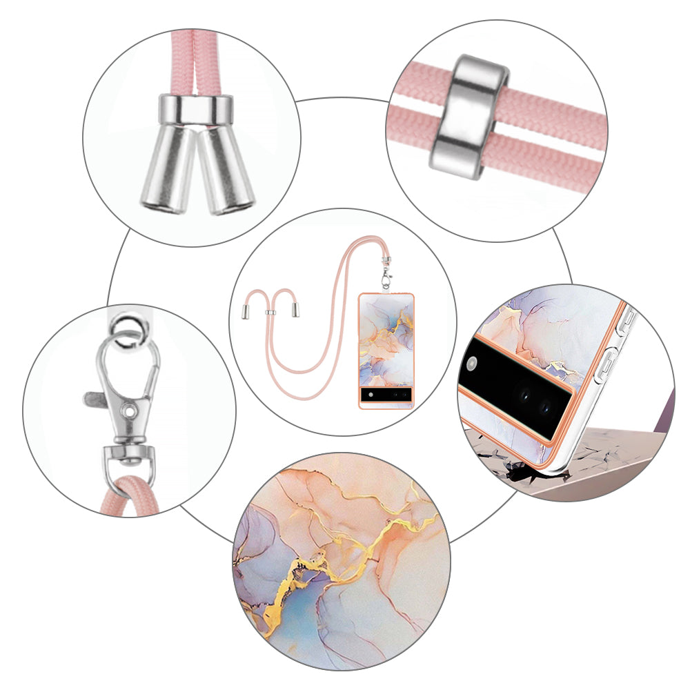YB IMD Series-4 for Google Pixel 6a Thin TPU Case Electroplating Marble Flower Pattern IMD Phone Cover with Lanyard - Milky Way Marble White