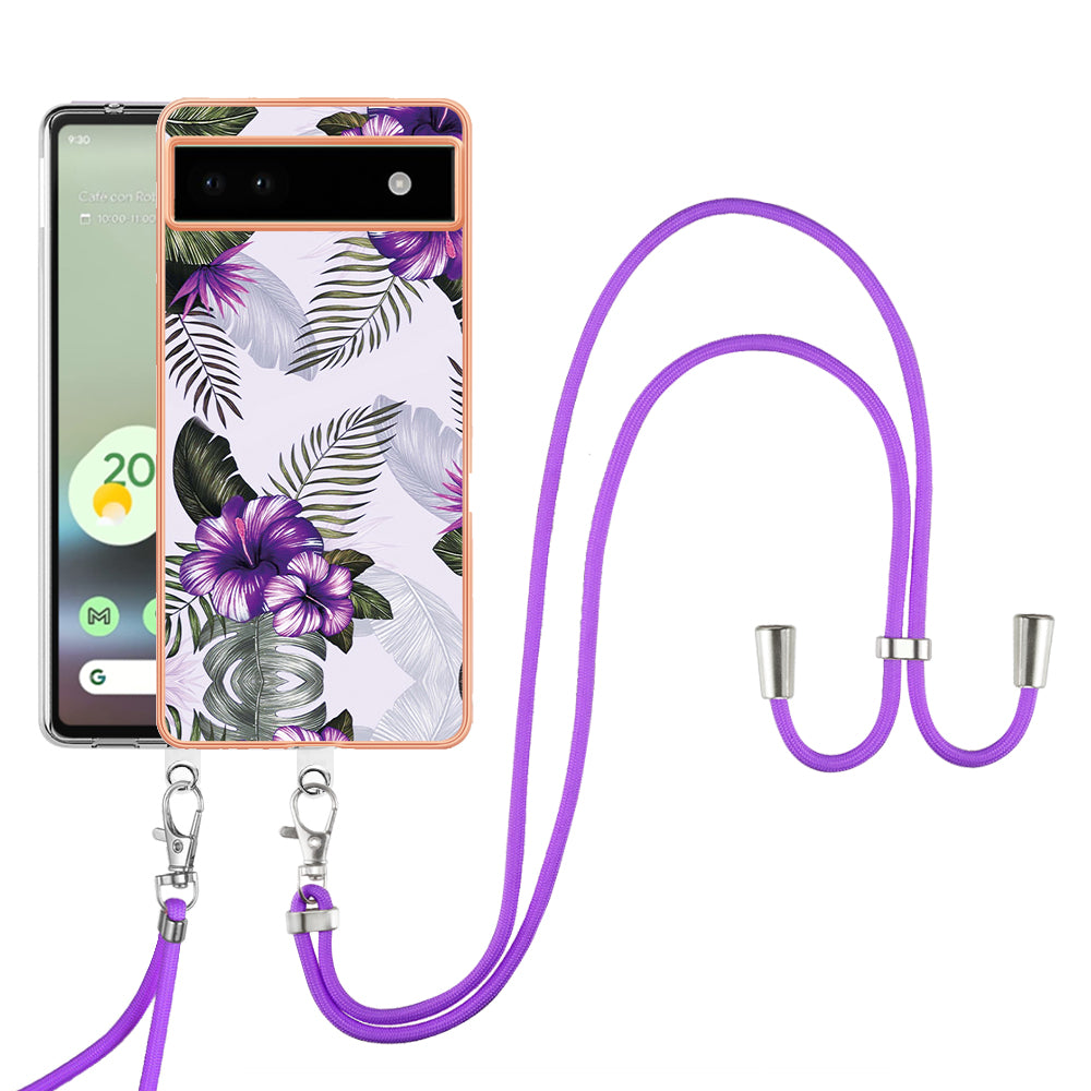 YB IMD Series-4 for Google Pixel 6a Thin TPU Case Electroplating Marble Flower Pattern IMD Phone Cover with Lanyard - Purple Flowers