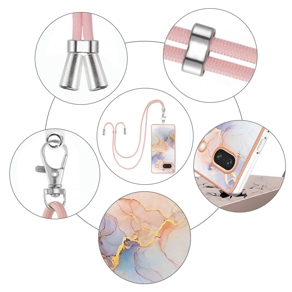 YB IMD Series-4 for Google Pixel 7a Marble Flower Pattern Protective Case Electroplating IMD TPU Phone Cover with Lanyard - Milky Way Marble White