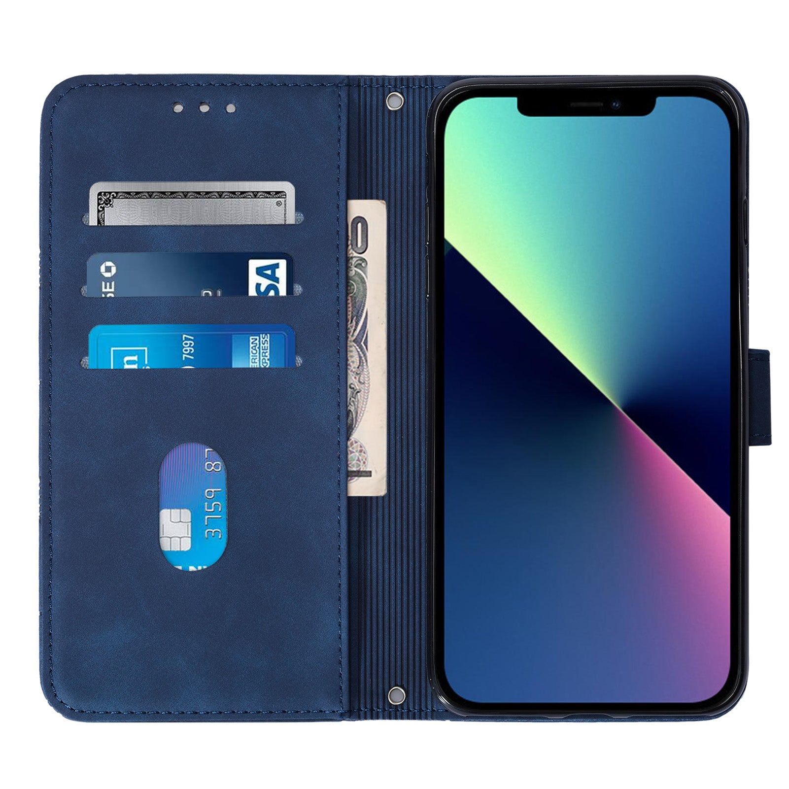 YB Imprinting Series-1 for iPhone 15 PU Leather Phone Case Imprinted Wallet Stand Cover with Hand Strap - Sapphire