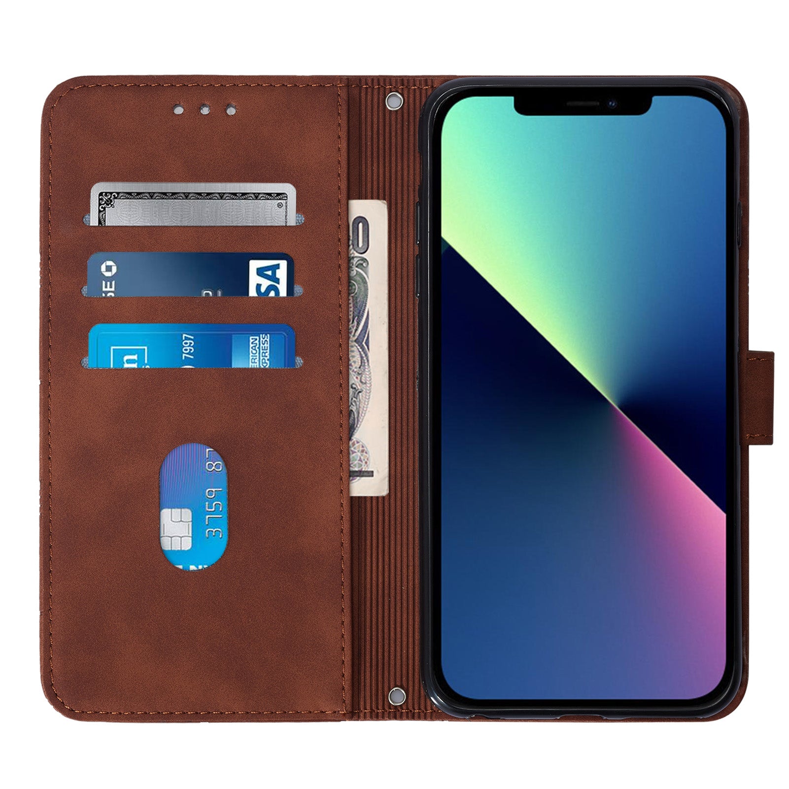 YB Imprinting Series-2 for iPhone 15 Imprinted Stand Cover PU Leather Wallet Phone Case with Shoulder Strap - Brown