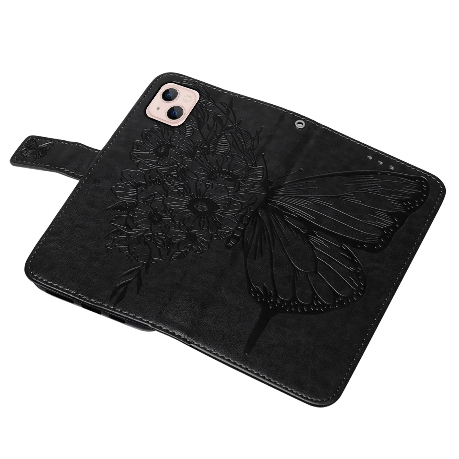 YB Imprinting Series-4 For iPhone 15 PU Leather Stand Phone Case Wallet Butterfly Flower Imprinted Cover with Hand Strap - Black